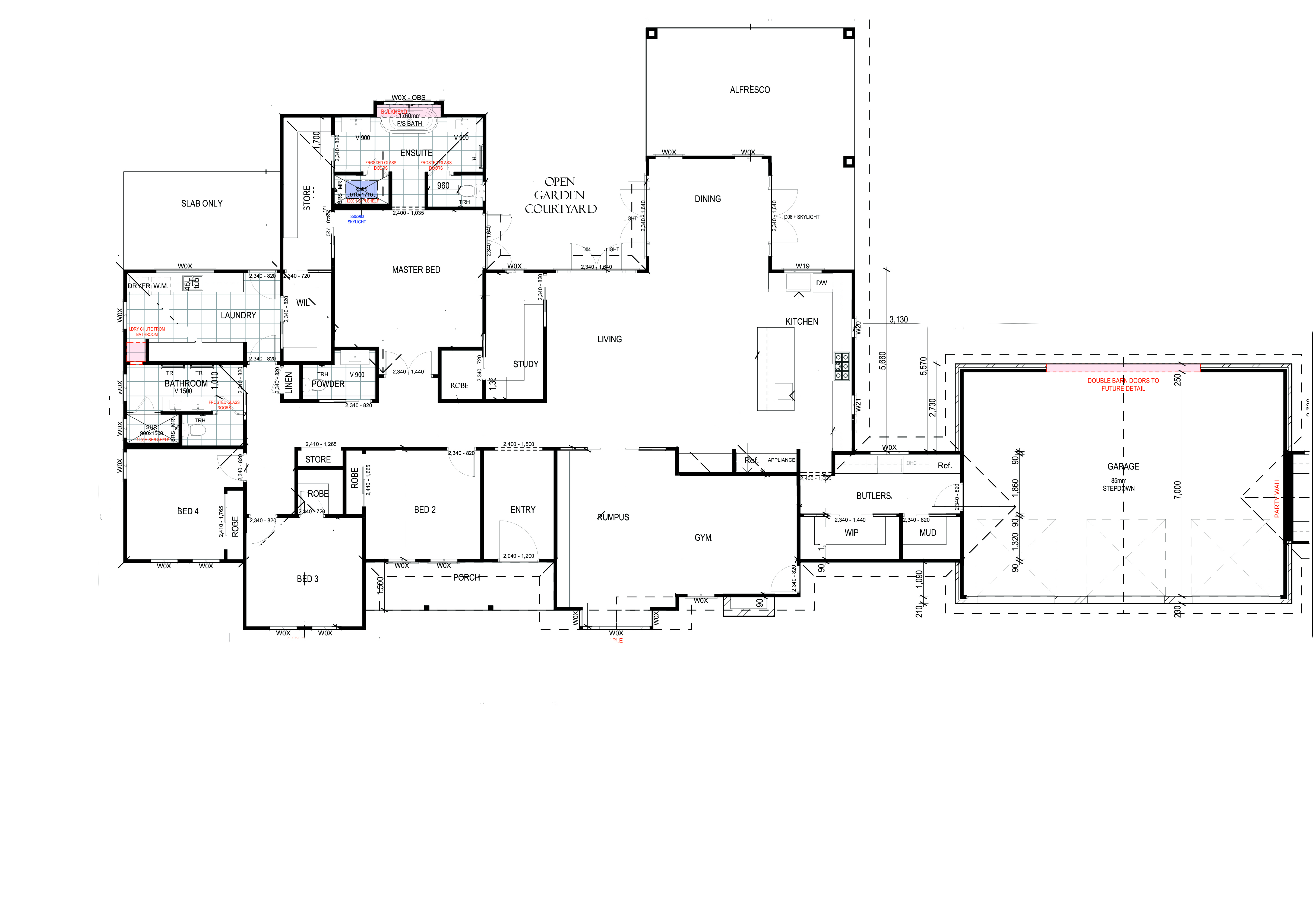 floorplan to top view in hand drawn detail adding furniture timber floors running down the page tiles to alfresco australian natives with festoon lights to open courtyeard keep bathrooms in their exact layout adding dining table and chairs to dining room rumpus is second living add chairs to study desk and to island in kitchen