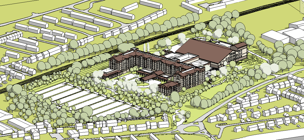 add reflection to glass main building is surrounded by greenery surrounding buildings are to be brick with red tile roofs park many cars randomly on the car park and add cars on the roads add more greenery this is summer morning scene with sunlight coming from the bottom right side of the scene add railway line along the row of trees in the upper part of the image closer to the building make sure cars and railway match the scale of the building