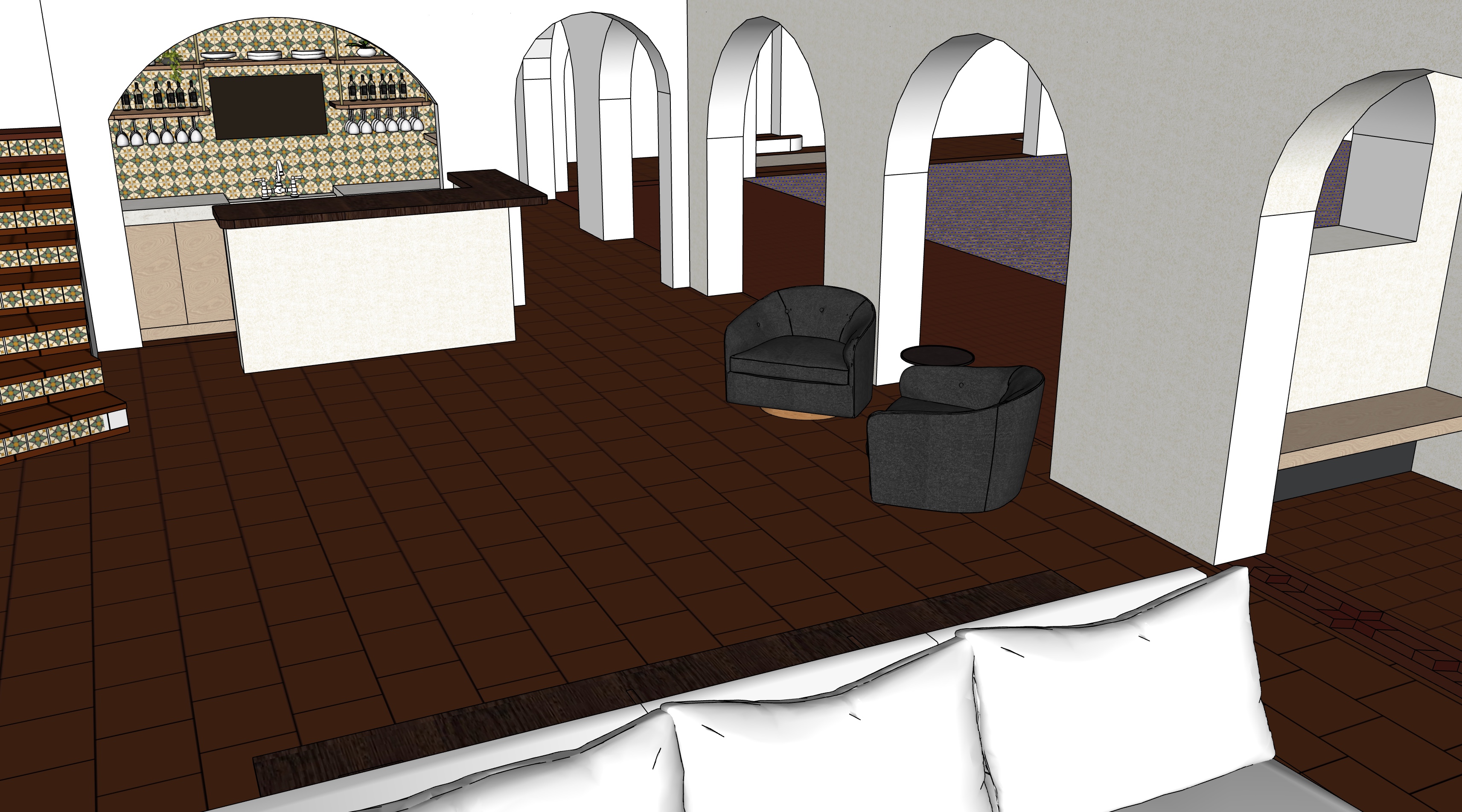 all arches on the wall to the right with he exception of the 1st arch closest to the foreground of the image are arched windows with black trim make sure the terra cotta flooring continues outside beyond the arched windows and where you see a lighter grey brown surface on the ground should be replaced with tall decorative grasses and desert plantings natural light should come in through the windows