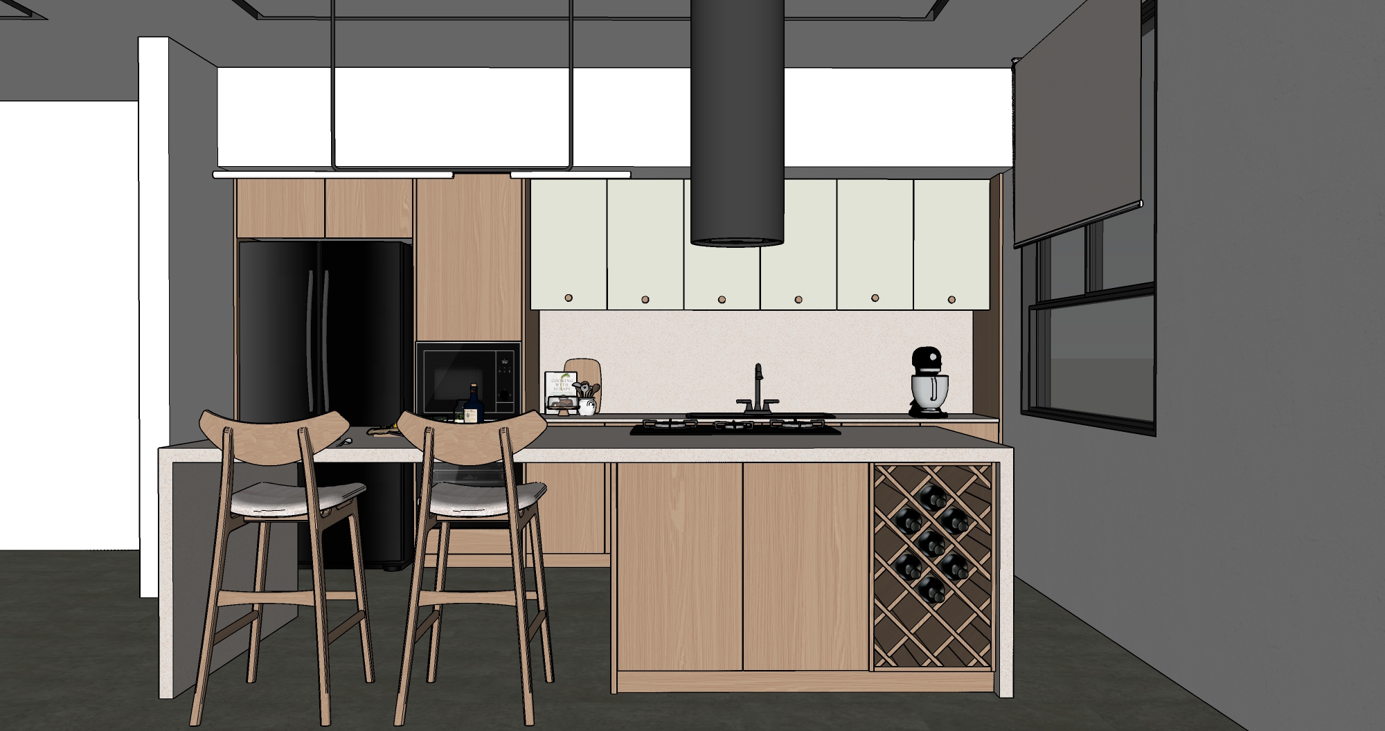 make the image appear realistic with a balanced mix of natural and artificial lighting but without showing any lamps above the backsplash or any direct light sources use satin smooth and clean textures avoid overly rough or bold patterns while still maintaining a realistic appearance adjust the window area to appear brighter and include an outdoor view the island table backsplash and floor should feature materials from quadra terrazzo ivory with the floor specifically using a concrete floor