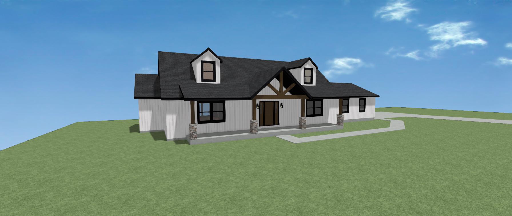 make photorealistic outdoor scene of this home on a wooded county lot with attractive landscaping and yard