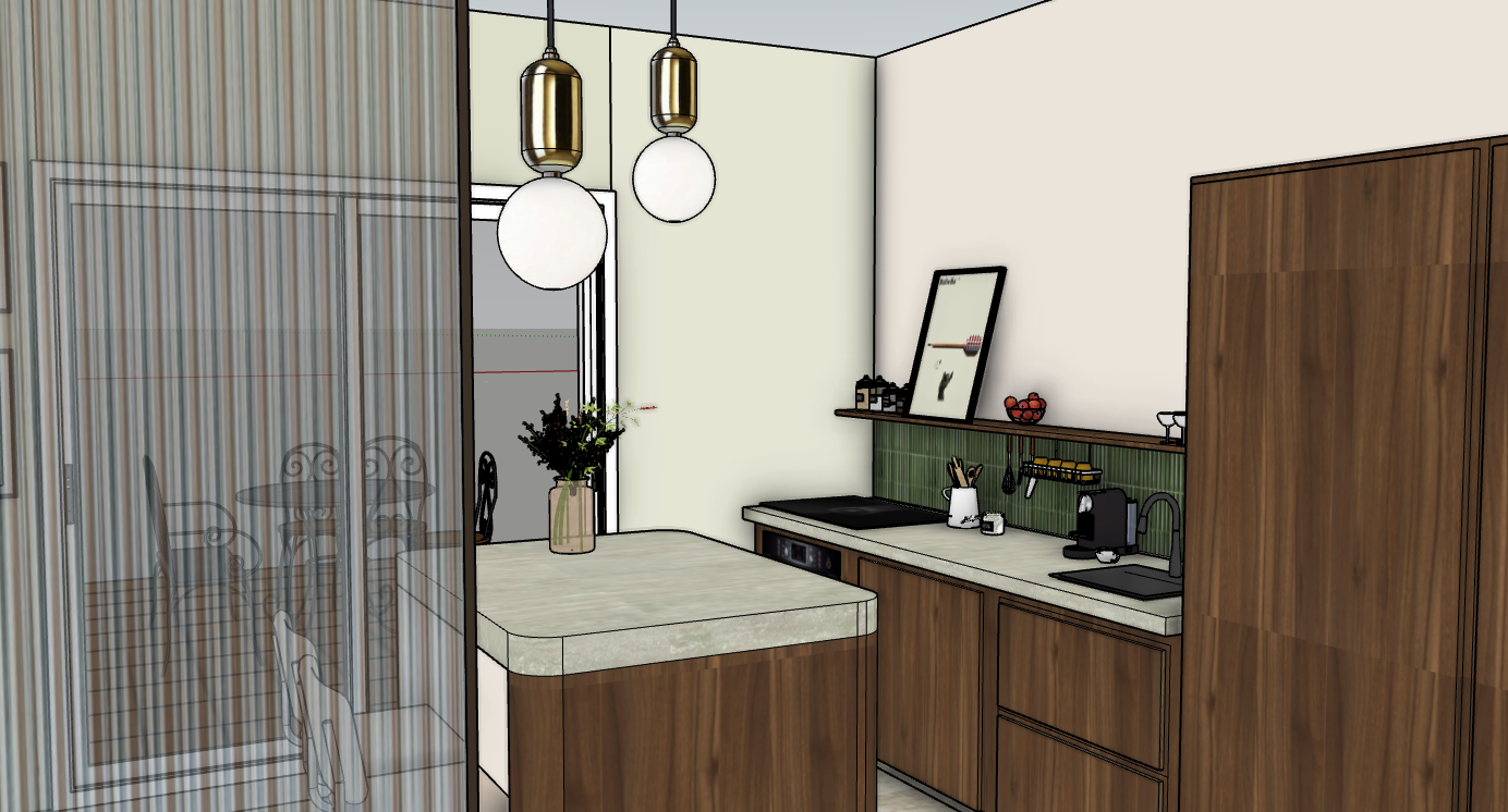 photo realit modern kitchen with the view on a terrasse in a private garden warm daylight