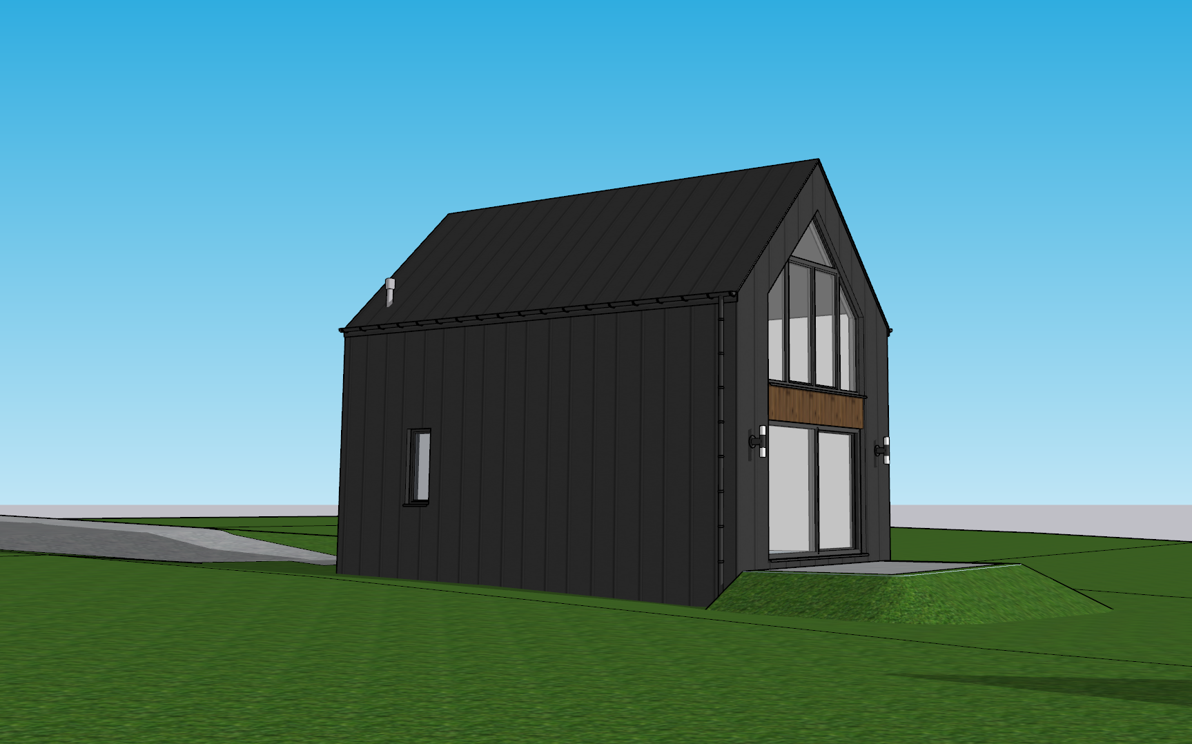 metal dark roof wooden walls dark plaster dark windows and door courtins in windows low bushes and flowers garder furnitures at the terrace playing kids