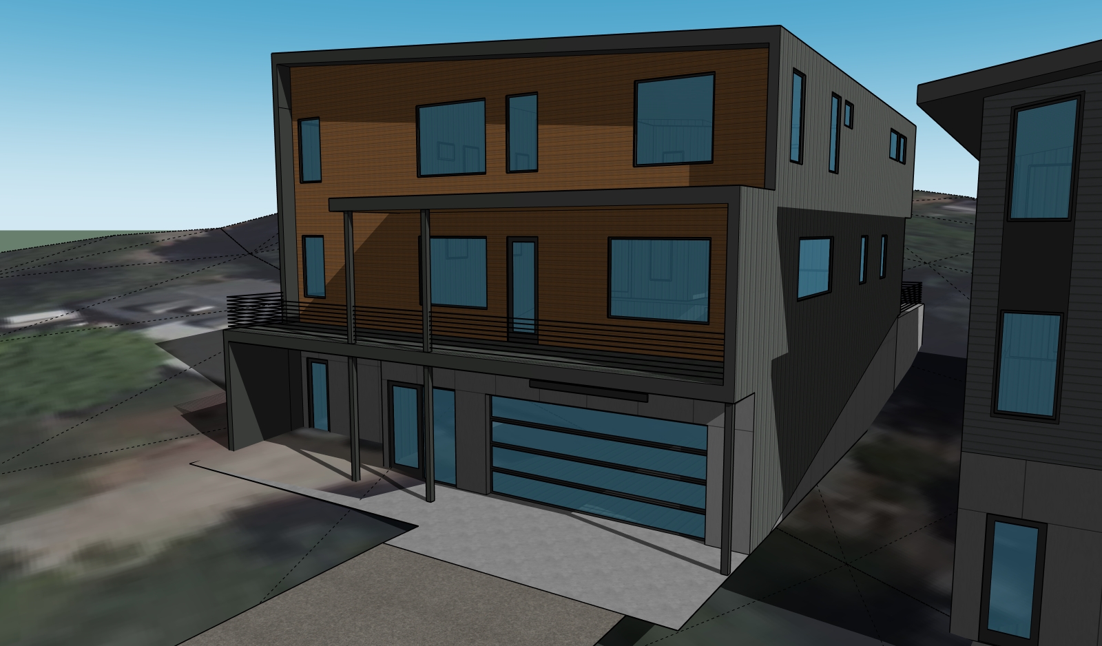 turn the attached sketchup rendering into a photoreal rendering of the house keep geometry massing window placement and details the same high fidelity and representation is important this should be a daylight overcast rendering of the house the foreground should be a hill up to the house the adjacent landscape should well established native plants to the sides and grass in the area directly in front of the house deciduous trees behind the houses the base gray color is to be cast in place concrete brown wood within the front elevation plane is vertical v groove siding and the cladding up the sides is a charcoal gray standing seem roofing cladding which runs to grade with a small gap of concrete foundation wall the adjacent house on the right has a dark grey lap siding
