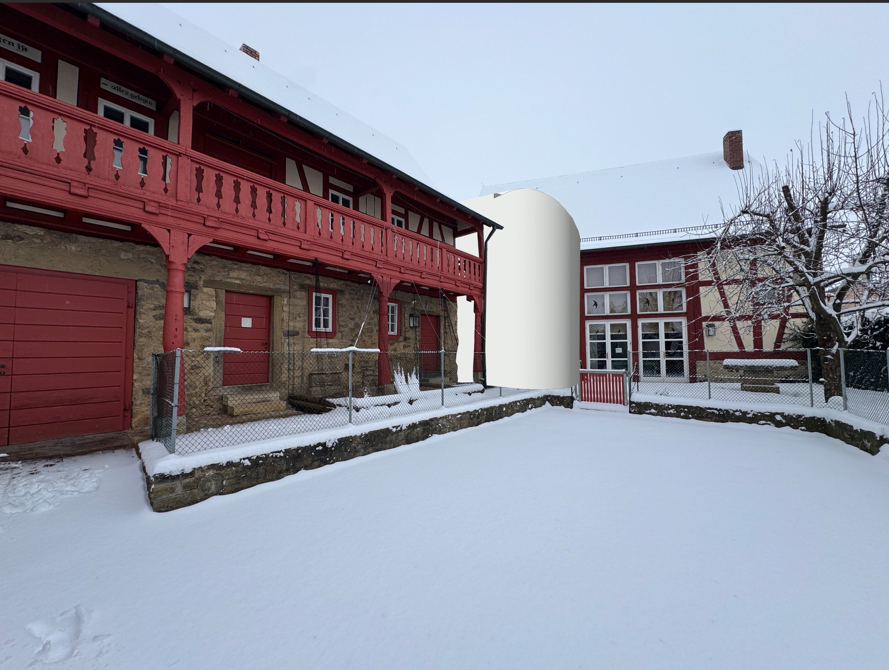 das was du als tank in der mitte in wei intepretiert hast soll ein treppenhaus verbinder zwischen den h usern sein er ist als rundes treppenhaus zu intepredtieren in gr e wie schon mit dem tank dargestellt es soll aus beton sein und sehr modern