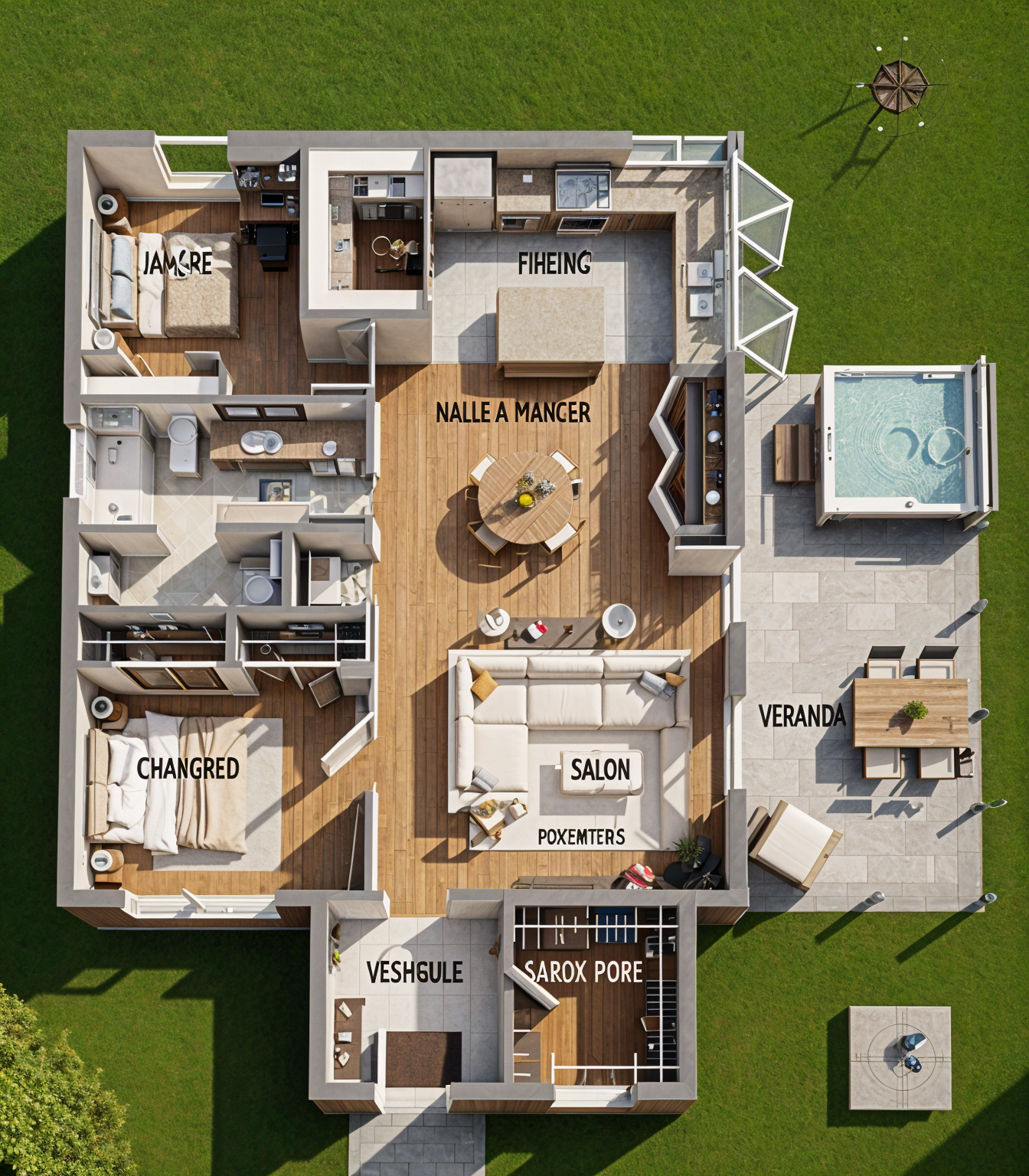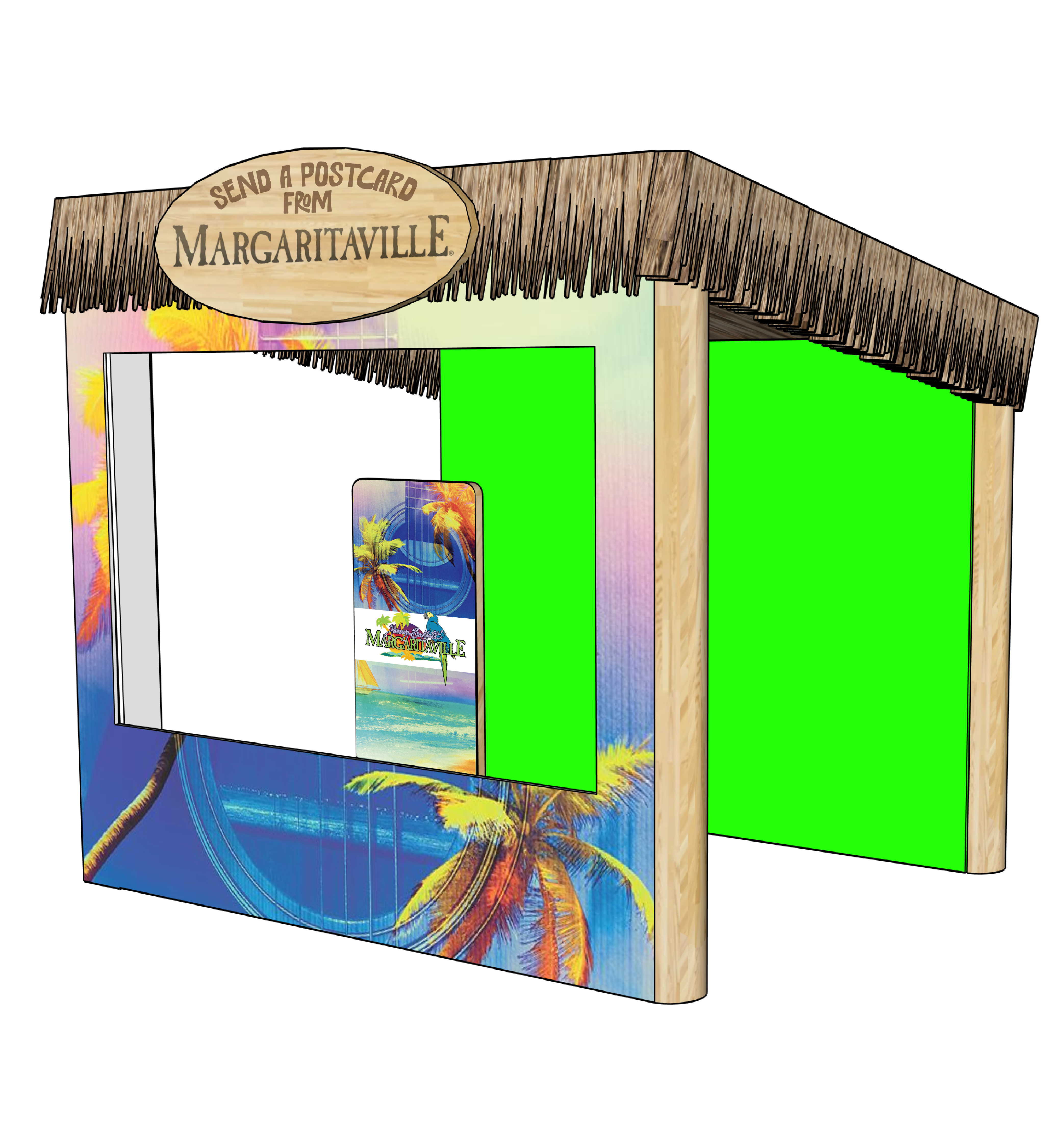 keep all materials colors text as is make more realistic roof is grass like a tiki hut there is a green screen wall place inside of a restaraunt style setting
