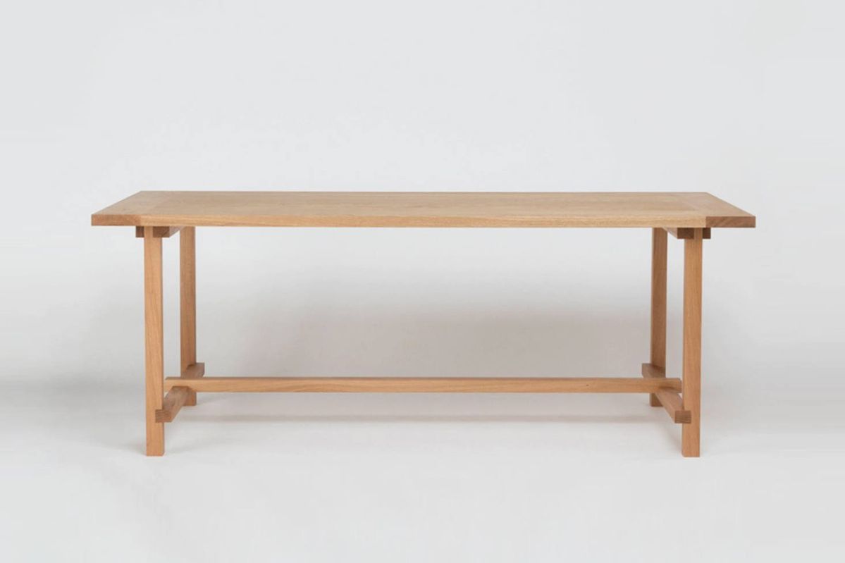 please change the table base of the table shown the vertical legs should be made of wood matching the material of the table top the horizontal crossbeam of the table frame below should be made of a round metal tube in ral 1011 color the horizontal crossbars that connect the two table legs on both sides are to be depicted as a round metal pipe in ral 1011 color don t change the table top or the table dimensions architecture