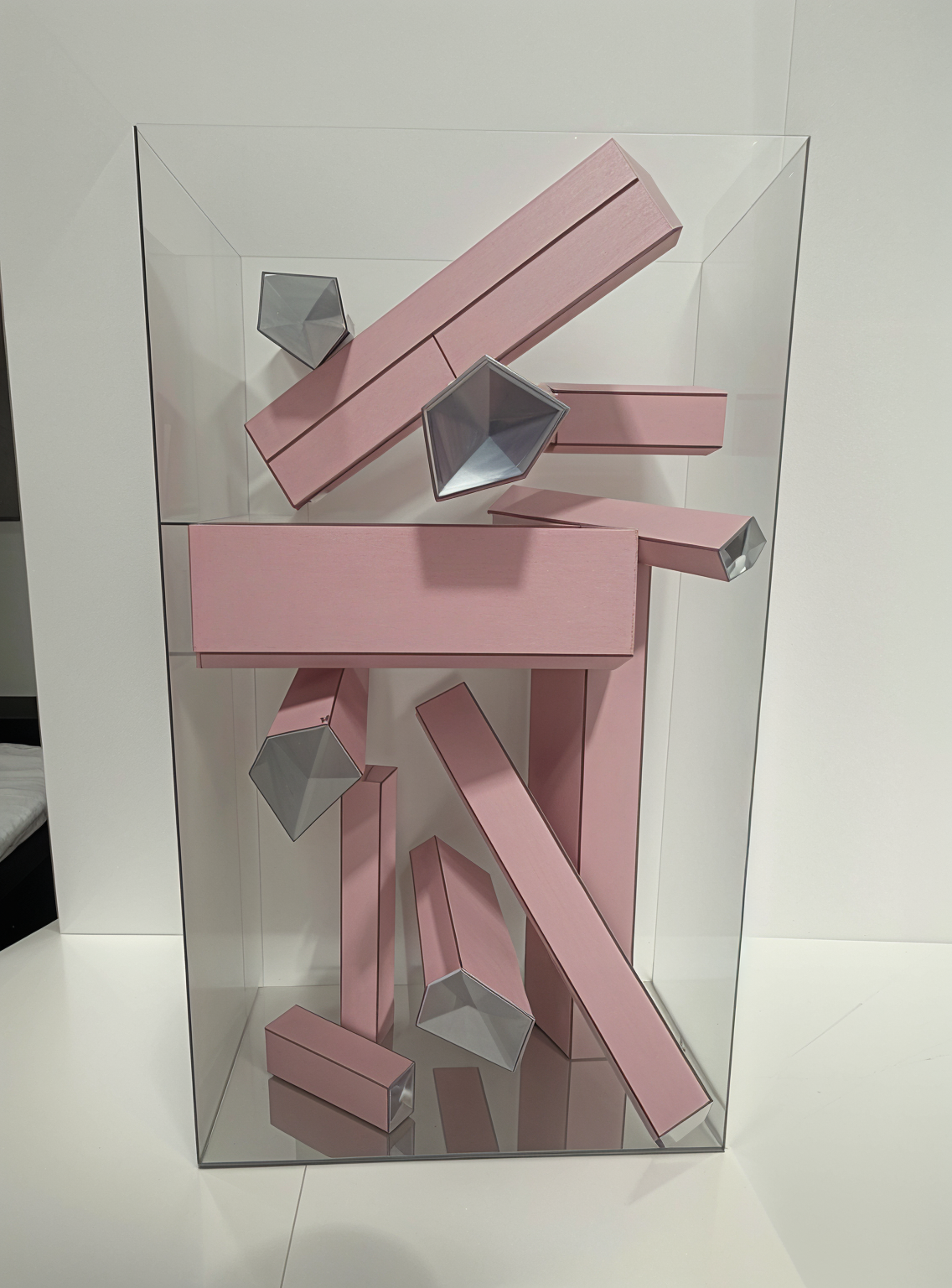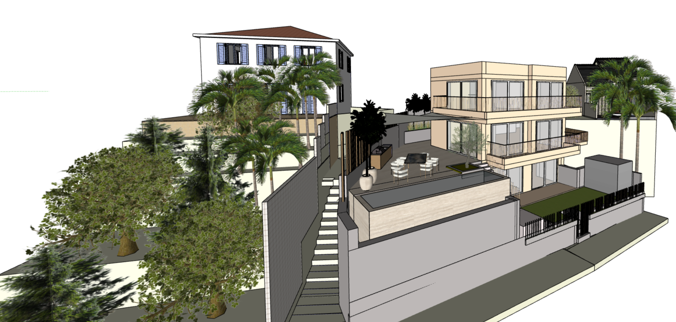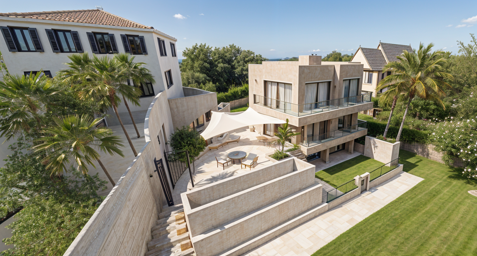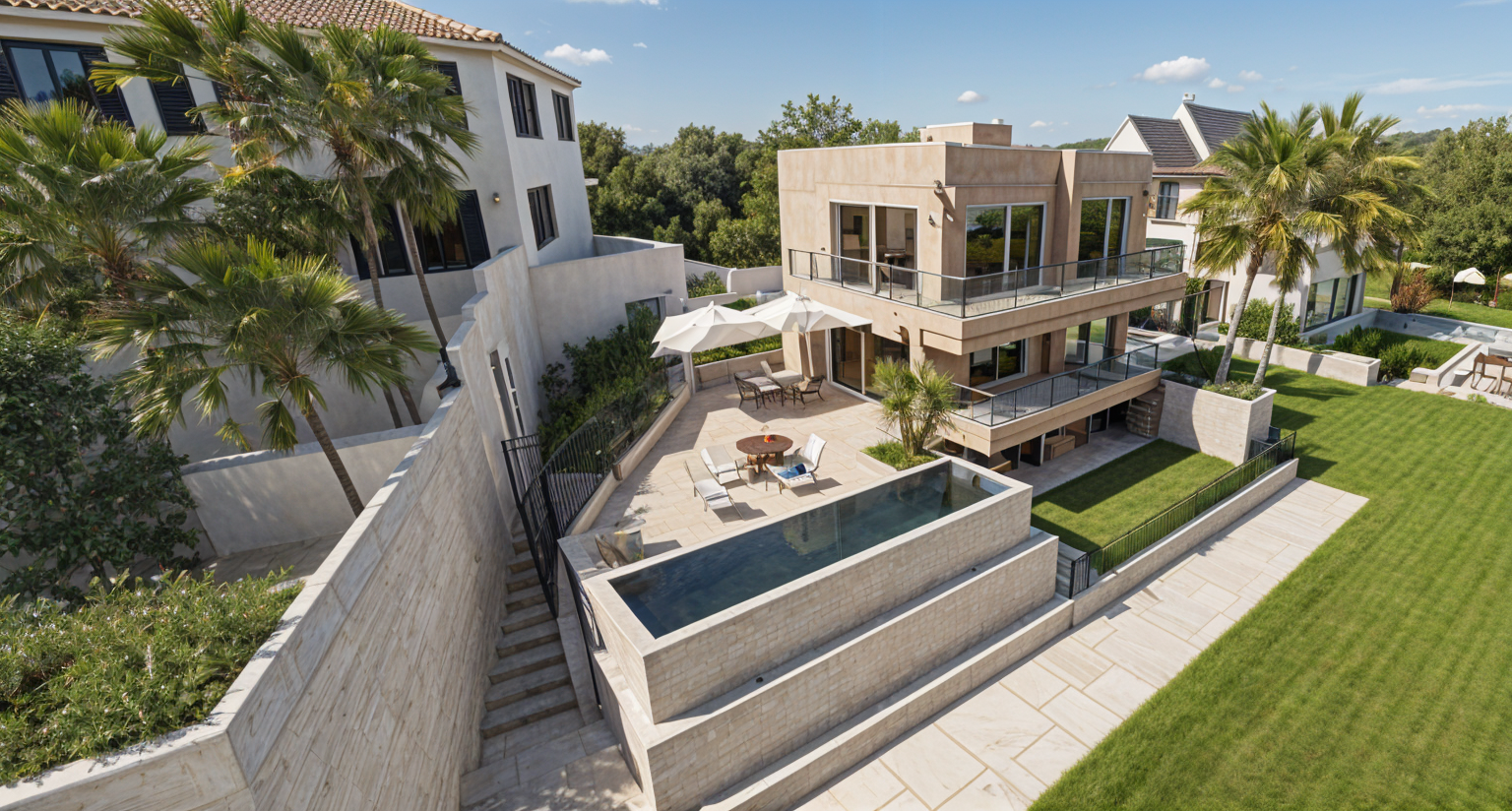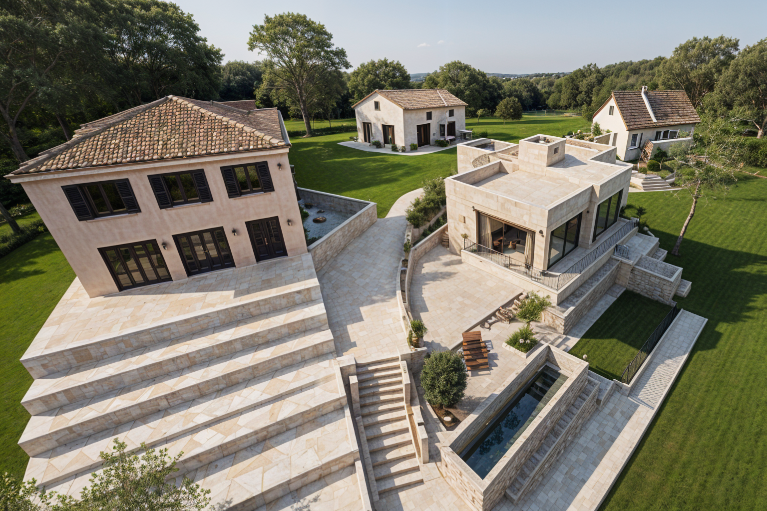 the main bulding is in shell pink color without any pattern floor is in light white cream marble color location is bra croatia and in the back there is house and trees