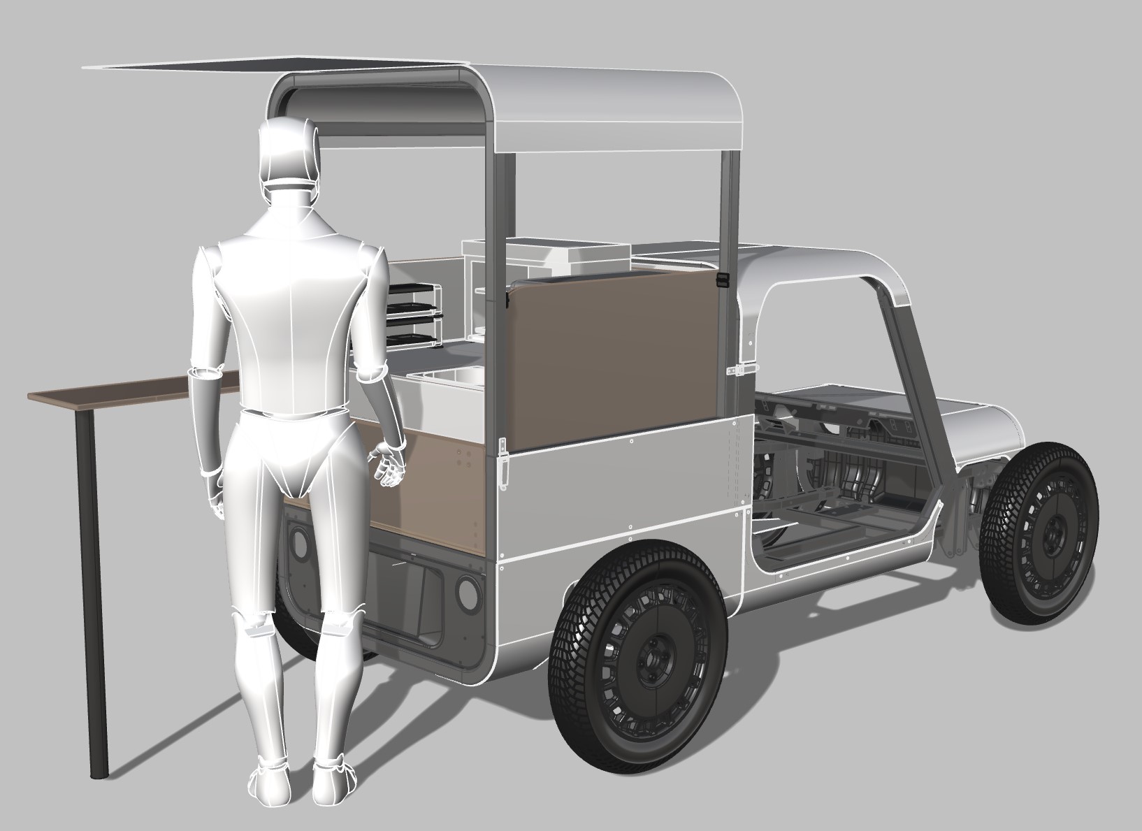 a raclette food truck setup in the back of the white car with black tubular frame a raclette food truck setup in the back