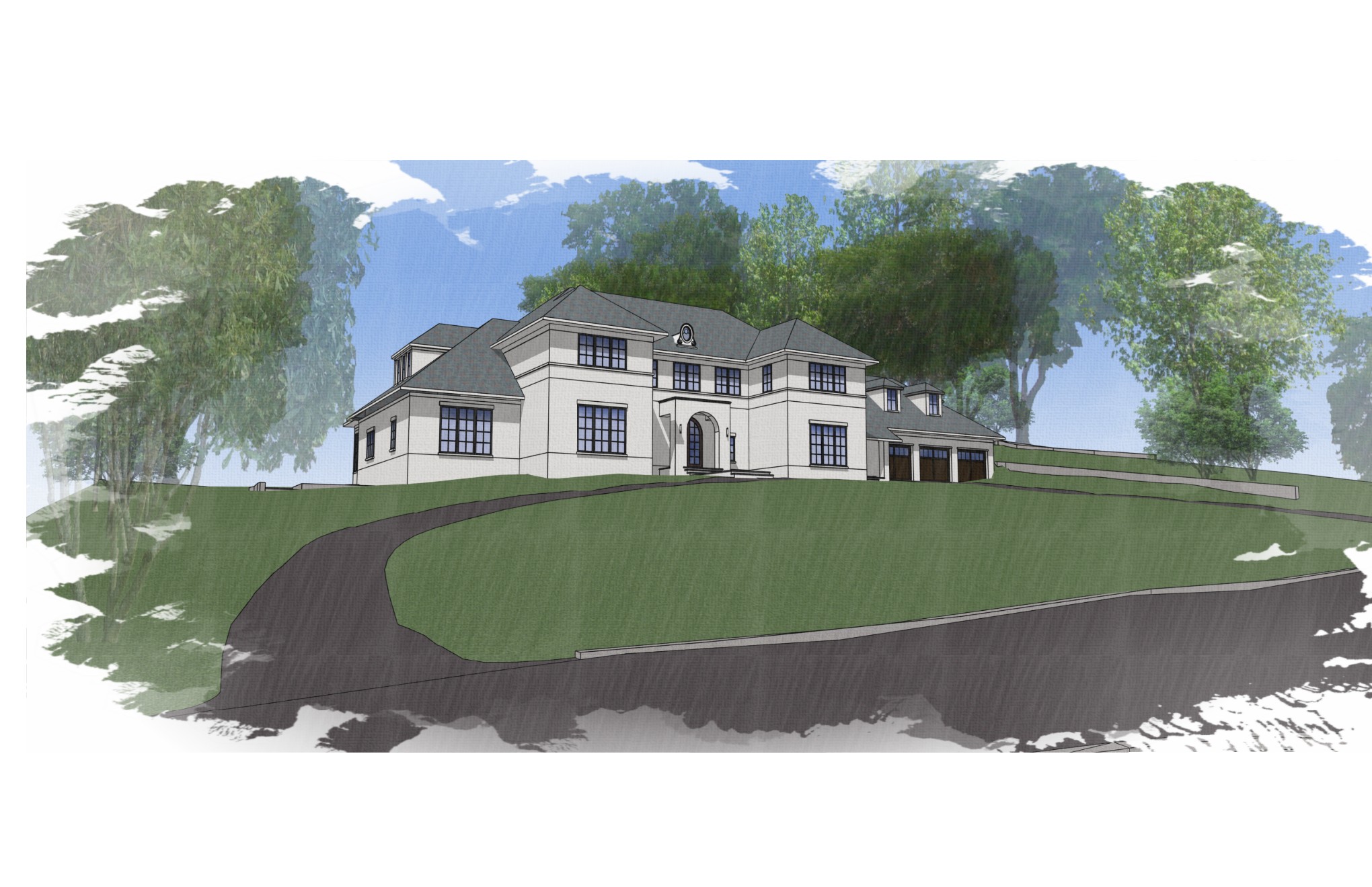 please create realistic rendering with realistic materials realistic landscaping with additional landscaping around the home such as small garden beds around the permiter of the home keep driveway as shown keep house as main focus house is all stucco no stone