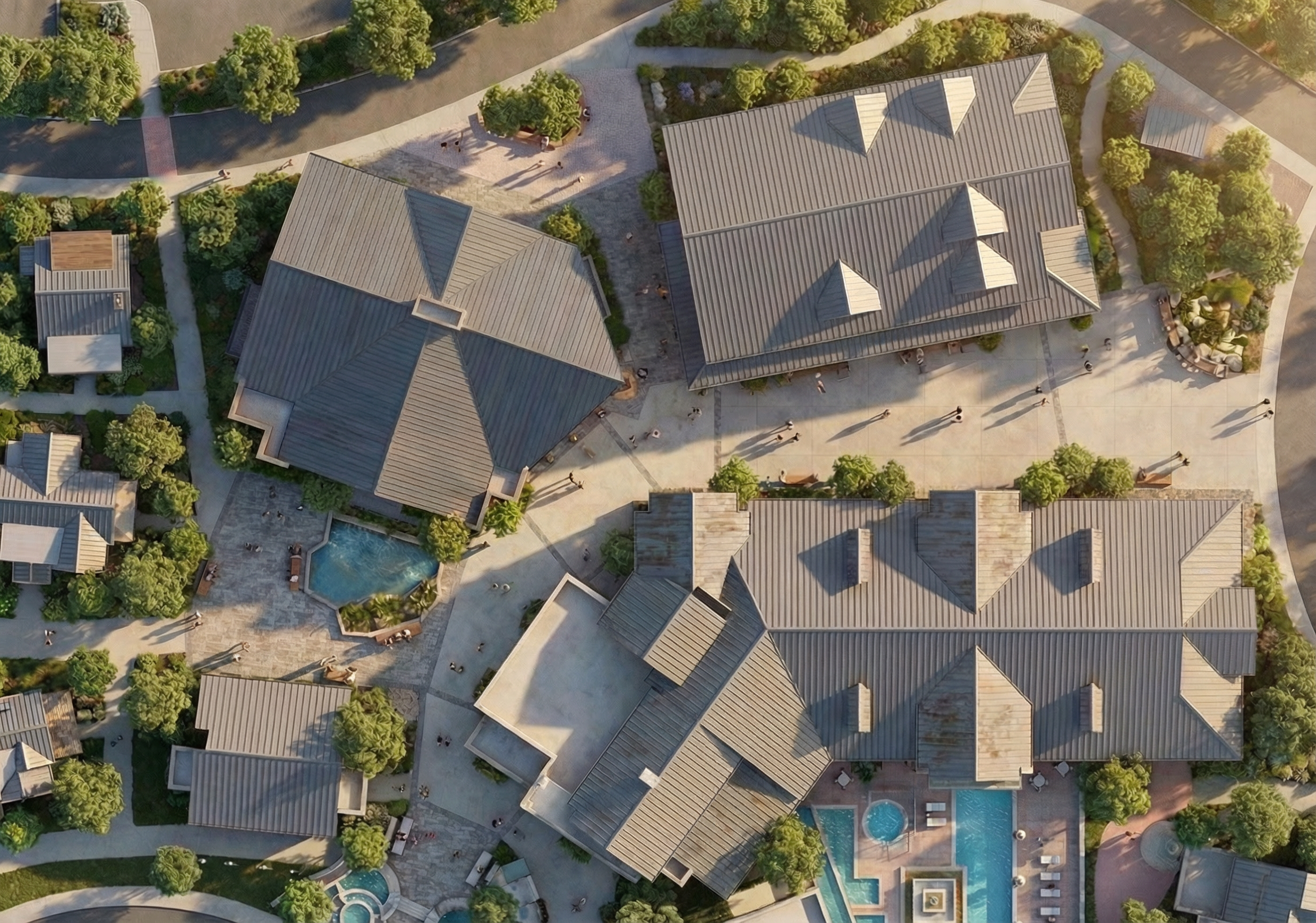 a beautiful suburban house at twilight featuring a steep gable roof exterior walls painted in dark warm grey and charcoal shingles stucco exterior with accent lap siding and stone the windows and doors have black frames with the front door featuring elegant frosted glass panels the garage doors are a crisp black with black handles the stone foundation and accents are in natural gray tones a warm glow emanates from wall lanterns with a bronze finish the evening sky is painted in rich shades of purple and orange enhancing the tranquil and inviting atmosphere lush green manicured lawn surrounds the house with flower beds bursting in vibrant reds and yellows all illuminated by subtle landscape lighting