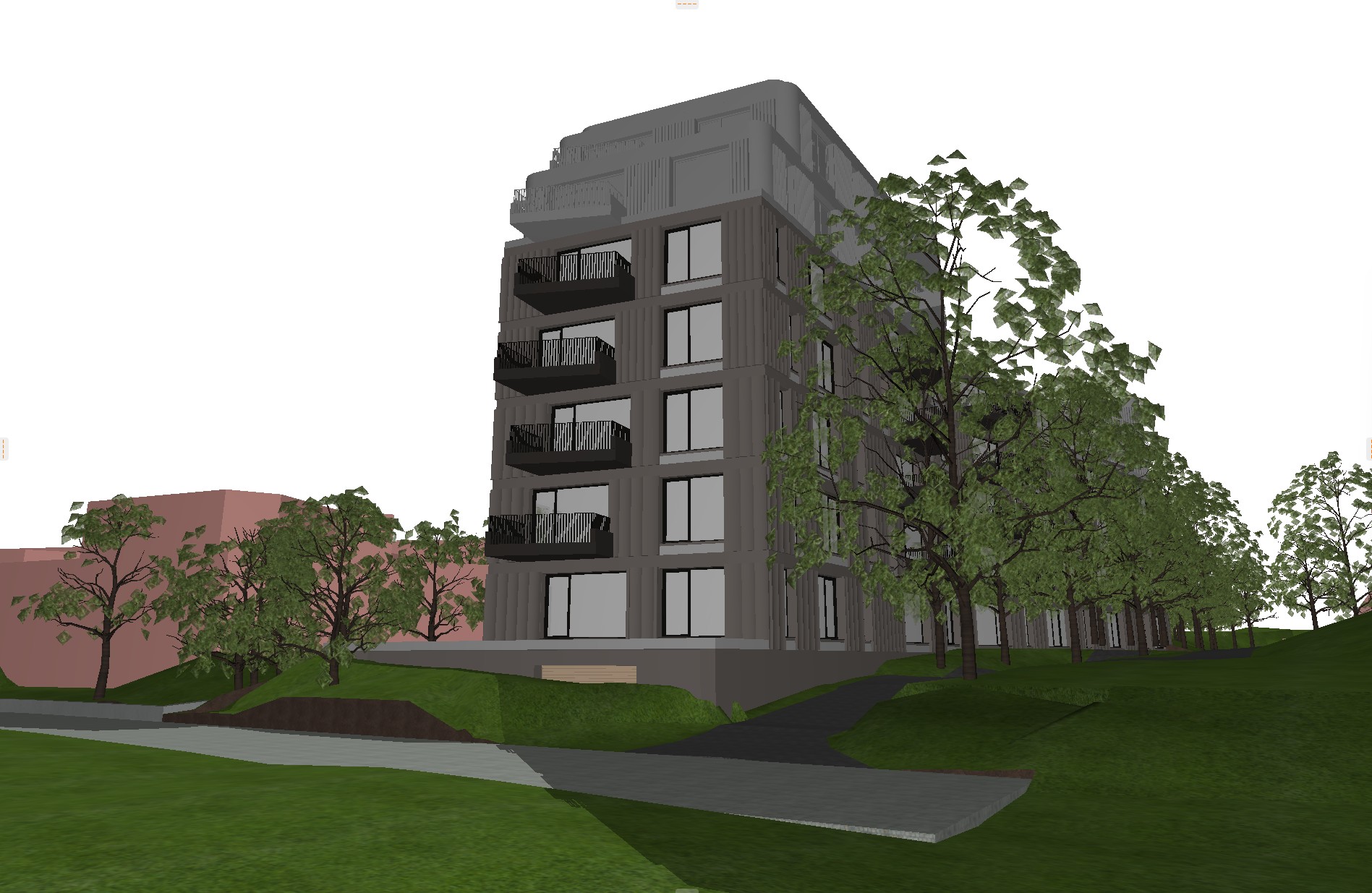 autumn sunny afternoon building with gray and white facade lots of pants and trees