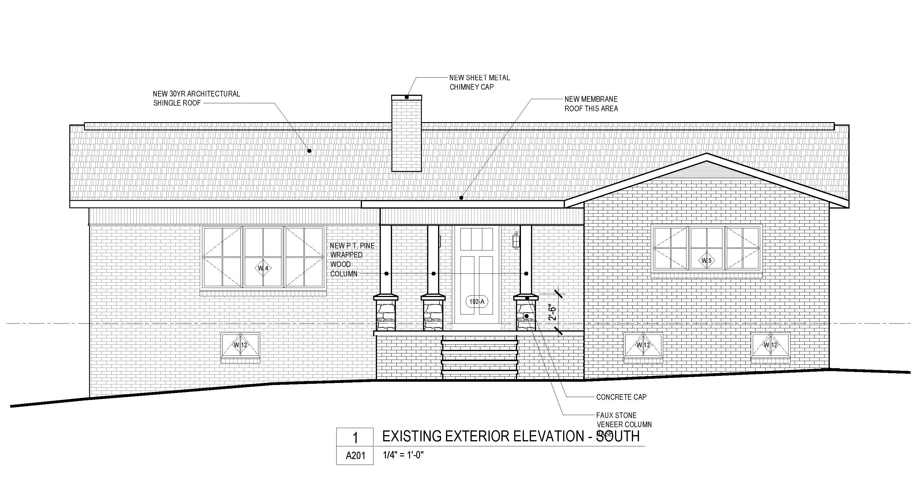 gray shingle roof white fascia black windows red brick gray stone white columns