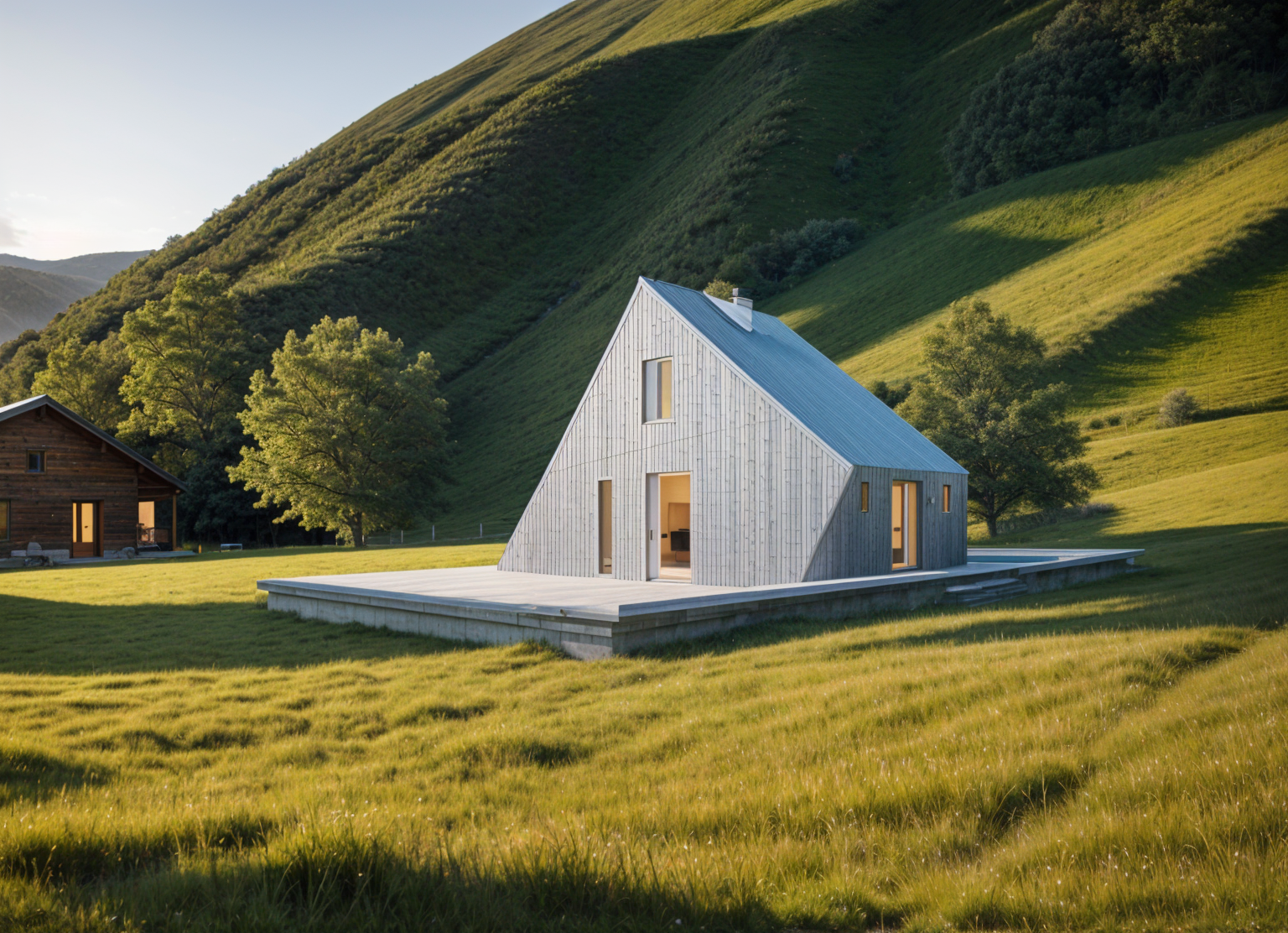 cottage with roof made of corrugated sheet metal and wooden facade on meadow in valley with hills in background architecture