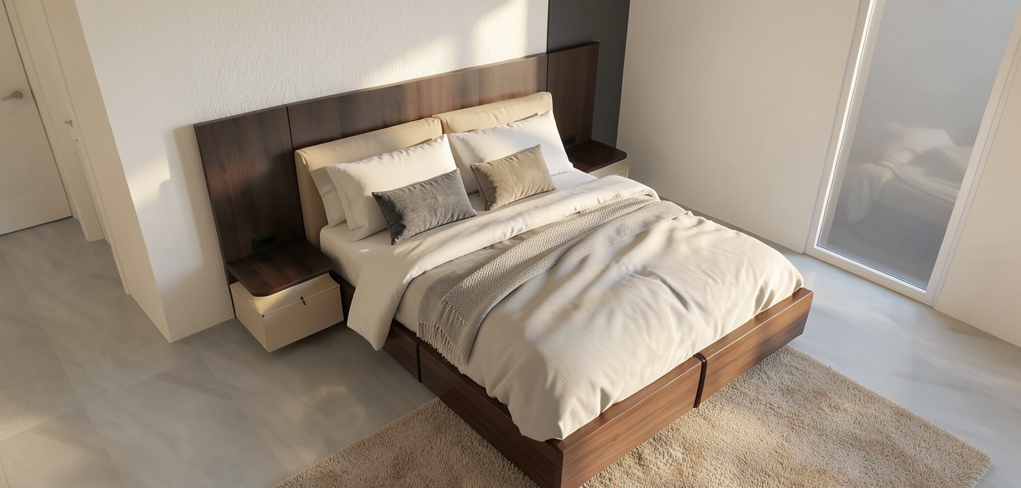 render a cozy space with natural light from the windows besides the bed and the ones in front where outside can be seen a beautiul well kept garden with a driveway with one car in it the bed itself is a cream colored with cream white and a light brown cover that gives off a homey feeling with dark wood behinde the bed that gives off a seren feeling as well as beige side tables that compilamnts the spave as well as a cream rug that has a uniqe design that gives off elegant vibes the hole room gives of vibes of a elegant minimalist design with some books in the side as a decore