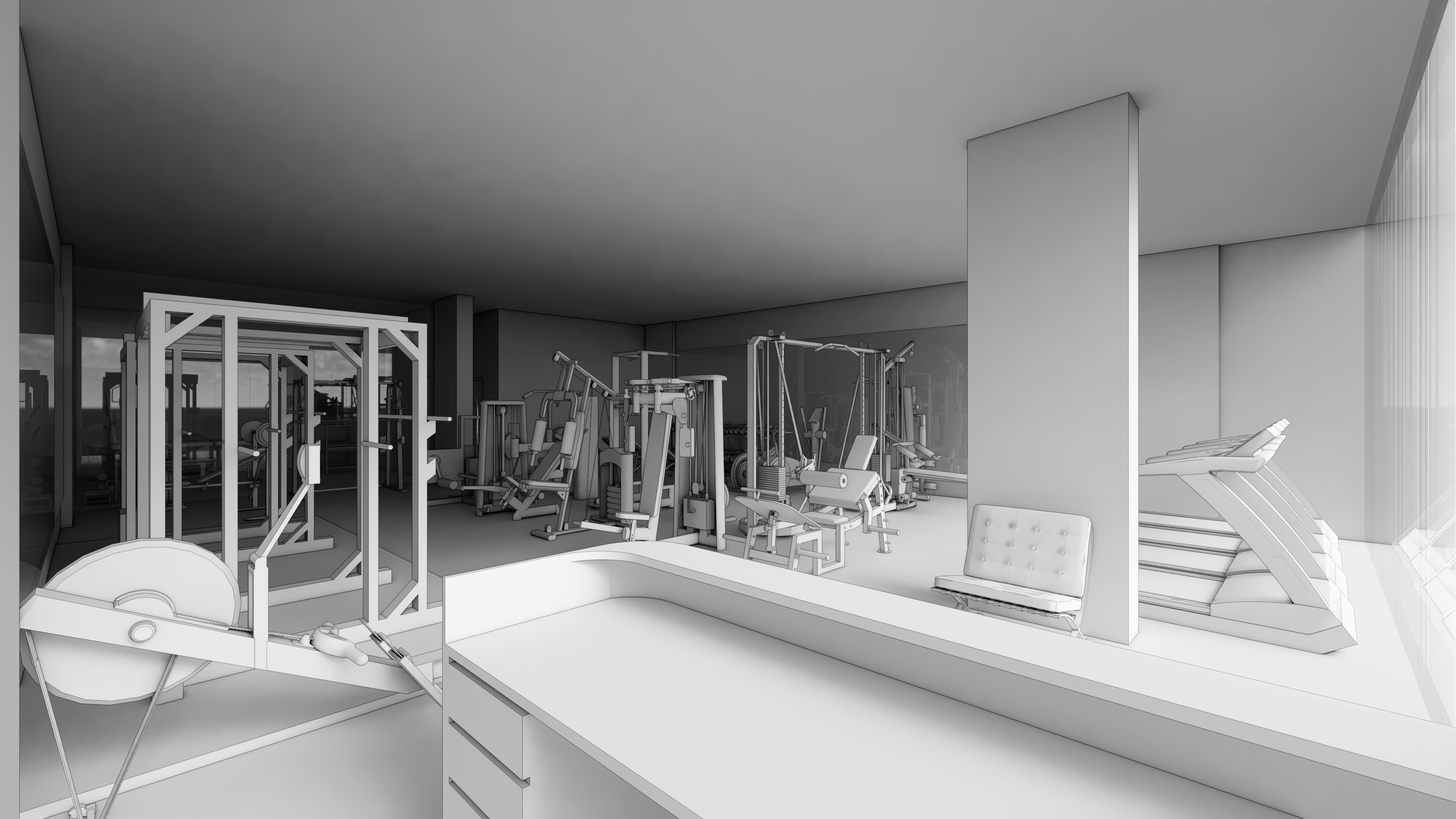 modernist interior shot a high end luxury gym interior moodboard with a soft minimalist wellness aesthetic focus on refined ceiling design with reduced wood smooth plaster or microcement ceilings combined with geometric backlit panel grids softly glowing diffused ceiling tiles and integrated recessed cylindrical downlights in matte black include subtle sections of light oak only as accents thin slats or trims not dominant walls feature large frameless mirrors spanning full height alternating with soft beige microcement and minimal light wood panel inserts include curved mirrored surfaces and seamless reflective panels to expand space and create depth add integrated niches with warm indirect led lighting flooring is a combination of warm toned microcement and light neutral stone matte finish with minimal wood presence clean seamless transitions between zones lighting is entirely soft and ambient hidden led strips 3000k warm cove lighting backlit ceiling panels and diffused glow surfaces no natural light no windows fully controlled interior lighting environment color palette cream sand warm beige soft taupe matte black accents and reflective glass mirror surfaces style is ultra luxury spa like gym environment presented as an editorial architectural moodboard with material samples mirror plaster stone minimal wood lighting studies and ceiling design focus ultra realistic textures soft shadows 8k resolution architecture