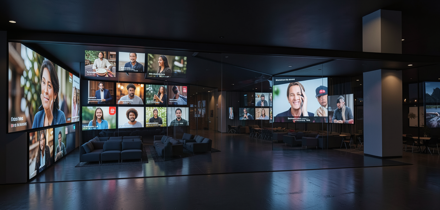 interior wtih multilple layered multized random screen wall video displays staggered differnt sizes and lighting for personality portraits and stories and theatre row seating dark lighting enclosed glass room portable seating in screen area small divided seating areas no seats w people in glass areas only