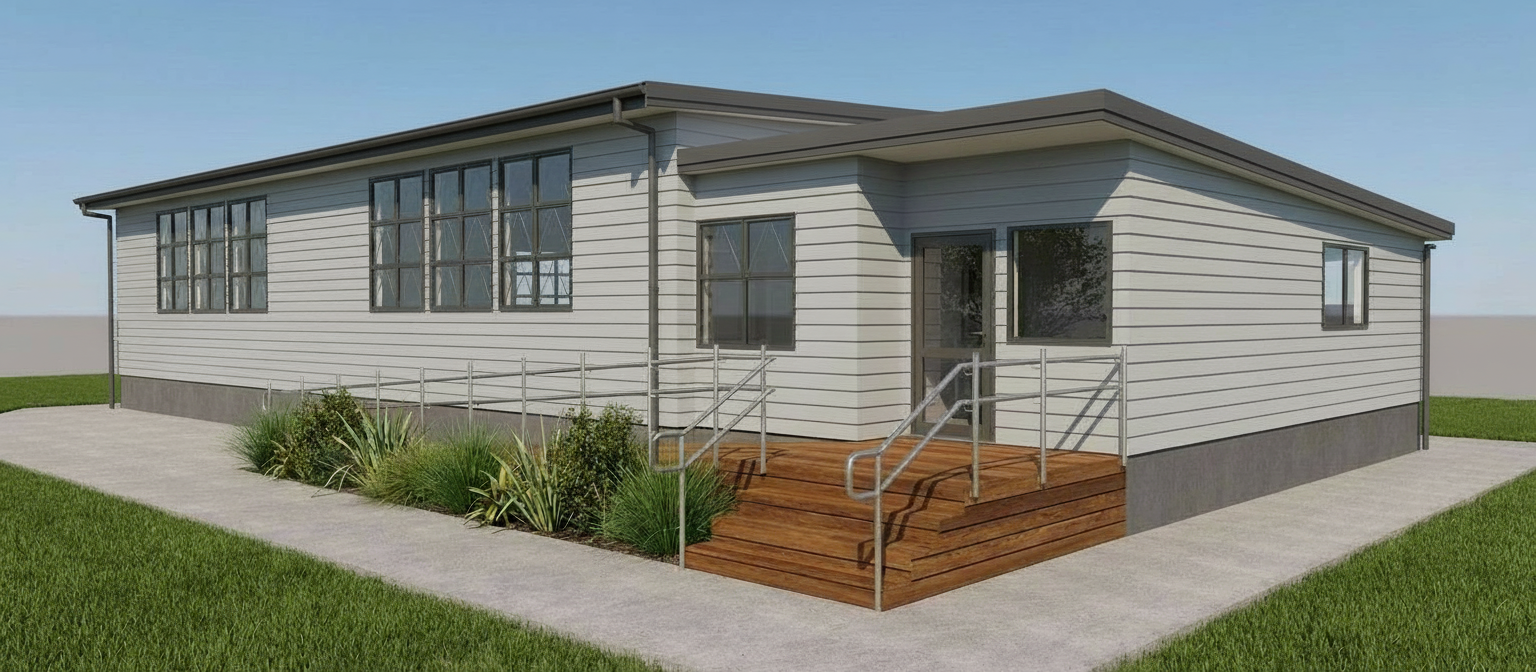 retain structure add grass bush and flax below ramp mid day lighting add open field background behind building