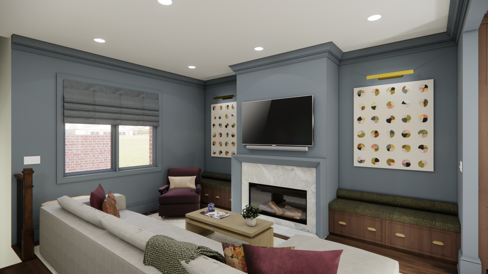 enhance the realism of this rendering keep all materials colors and finishes exactly as they are do not alter or recolor the roman shades or any other elements only improve lighting shadows and overall realism