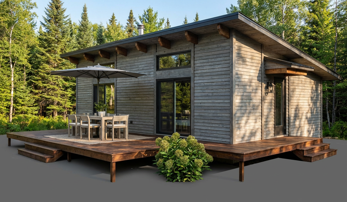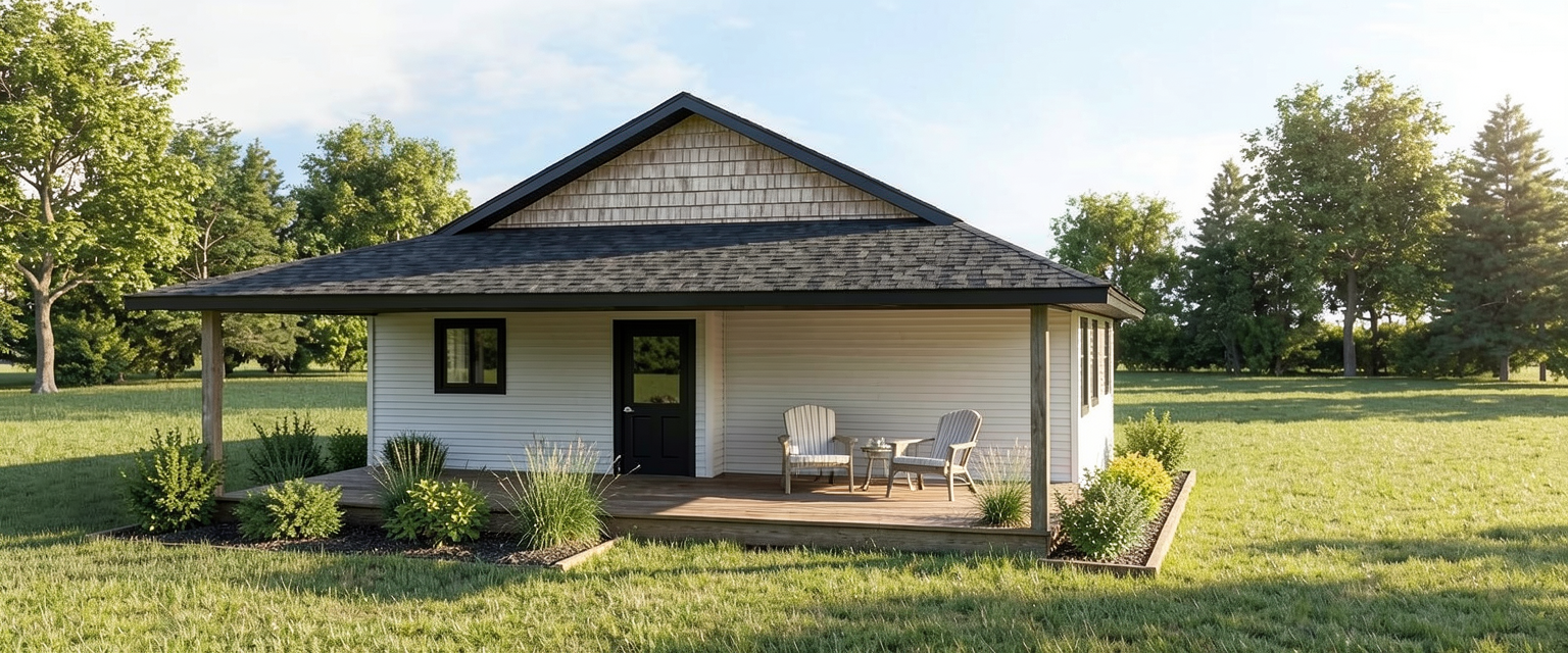 add minimal shrub beds add black window trim black soffit fascia add dark shingles add light colored shakes in the gables add deck furniture add horizontal siding on walls add concealed light to deck