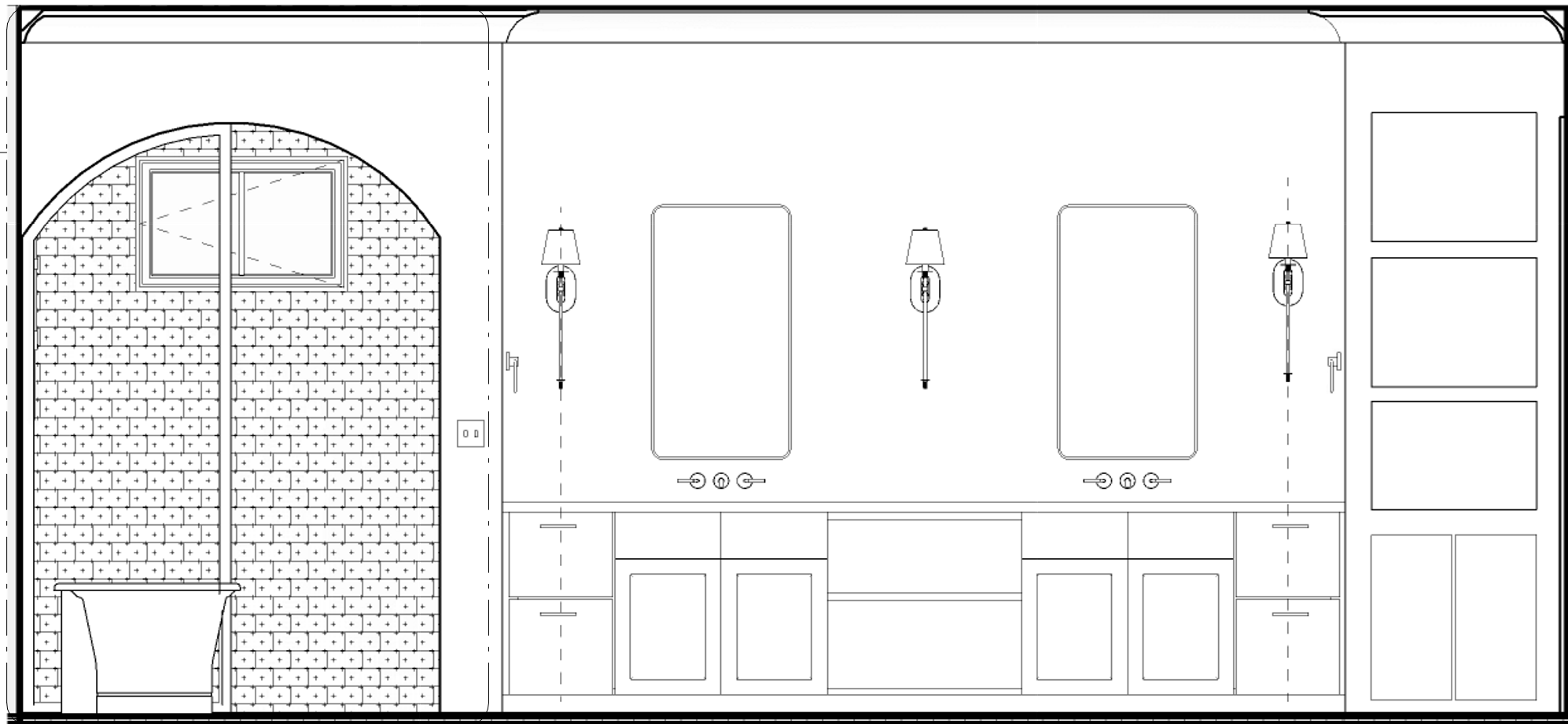morning light natural wood cabinets gold mirrors gold sconces white shades light light green shower tile remove tub black iron shower frame