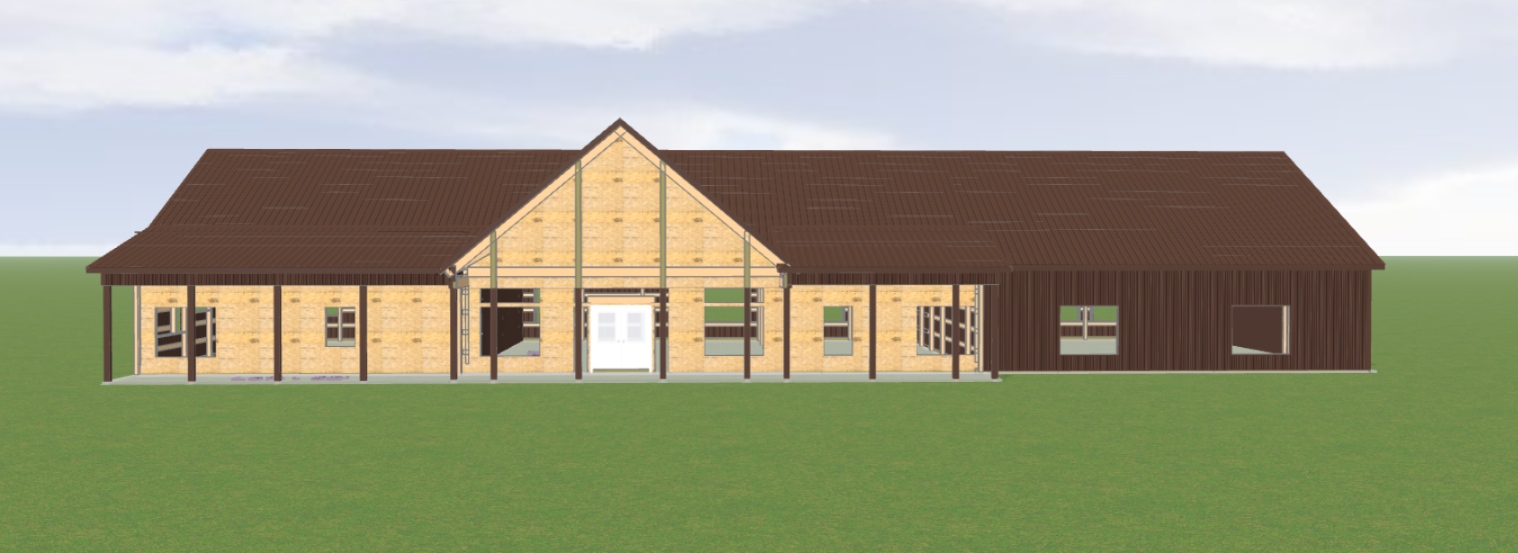can you make this look more realistic as if taken by a camera add a timber framed decorative truss in the gable of the porch stone on the entire front where the plywood is shown and on the porch posts add some rural trees in the background
