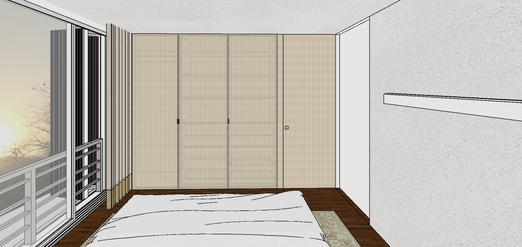 create a super realistic rendering of the bedroom keeping all original design features and proportions the room should be very bright with strong natural light and sunlight entering through the windows combined with artificial lighting to make the space even brighter maintain a soft warm and luminous atmosphere all fabrics should look realistic and textured showing natural material depth the wardrobe has four doors made of transparent material with color and texture similar to woven straw without glass and without handles the wardrobe should be closed and the doors should remain transparent letting light and shadows pass through naturally