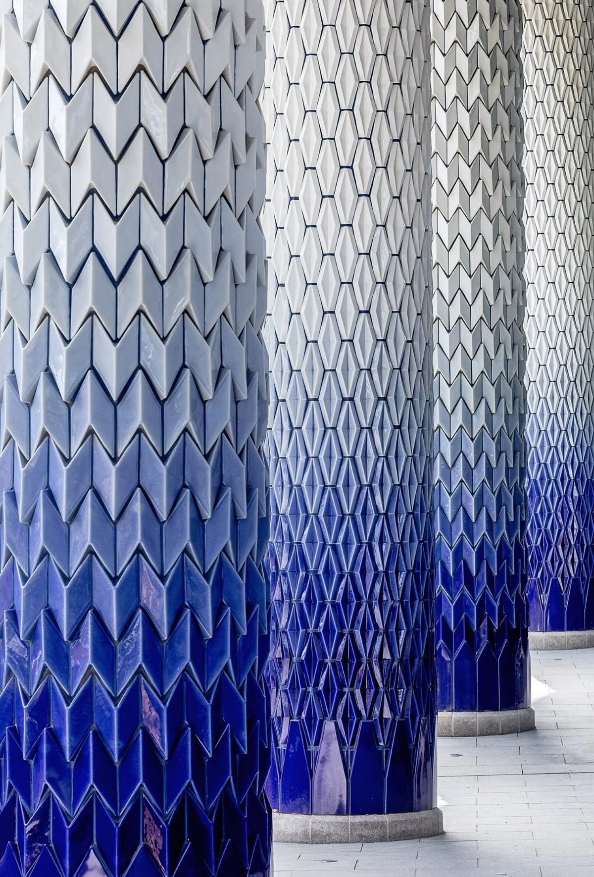 interior shot design a jewellery store interior incorporating ornate cylindrical columns decorated with intricate moroccan inspired geometric tile patterns in earthy tones and jewel like colors the detailed mosaic pillars should stand as artistic highlights within a minimal modern jewellery showroom ensure the tiles craftsmanship is captured with high detail and realistic textures place glass display cases around creating a fusion of traditional artistry with modern luxury design a jewellery store interior incorporating ornate cylindrical columns decorated with intricate moroccan inspired geometric tile patterns in earthy tones and jewel like colors the detailed mosaic pillars should stand as artistic highlights within a minimal modern jewellery showroom ensure the tiles visualize a jewellery store interior with tall cylindrical columns covered in a 3d geometric tile pattern transitioning in gradient shades from white at the top to deep cobalt blue at the base ensure the glossy texture of the tiles reflects the lighting elegantly the pillars should add a contemporary artistic touch to the space standing beside sleek glass jewellery showcases the overall mood should feel modern bold and luxurious
