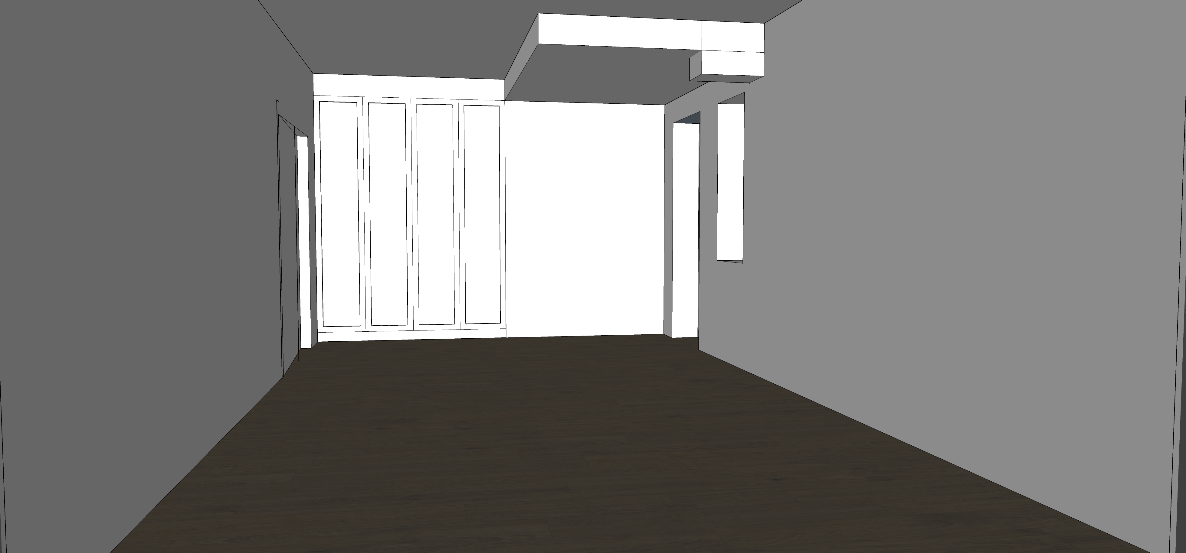 photorealistic interior render of the provided room keep exact same geometry proportions walls openings ceiling beam and perspective add a simple white plaster ceiling molding crown molding with height about 12 cm minimal and linear style the molding must run continuously along all the ceiling perimeter and wrap around the ceiling beam soffit element no changes to layout walls floor openings or volumes improve lighting with soft natural daylight realistic shadows slightly warmer tones enhance materials dark wood floor more realistic subtle reflections clean elegant realistic render