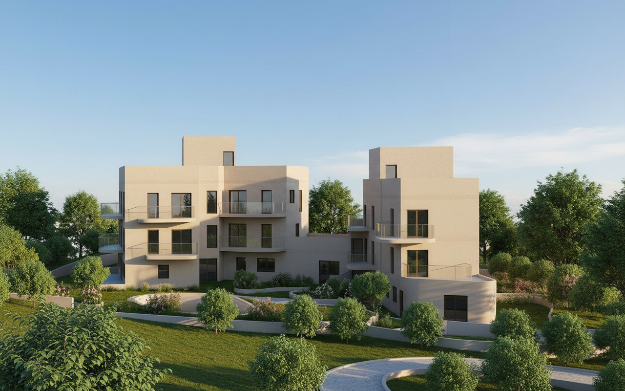 exact replication of the reference monument 19 circular metal profiles with varying lengths and curvatures maximum height 12 meters do not change the design do not add elements do not remove elements do not reinterpret exact geometry from reference image urban seafront promenade paved ground benches streetlights palm trees nearby buildings beach and sea only in the background no sand in foreground photorealistic architectural render summer day natural light