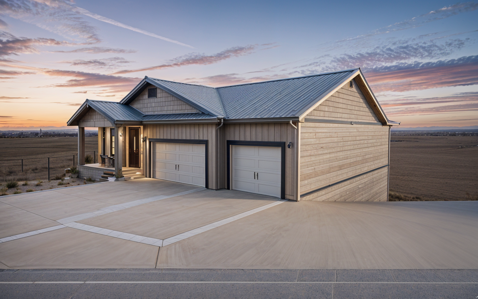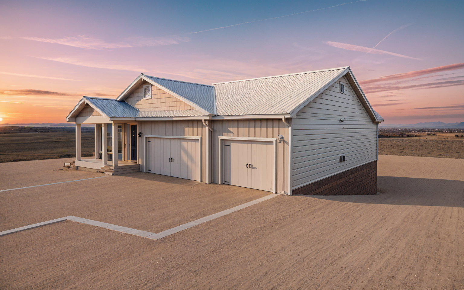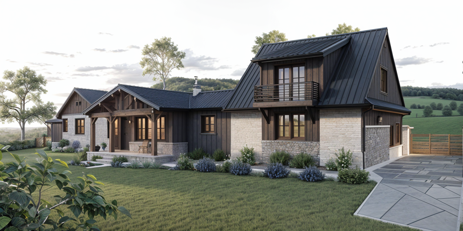 exterior shot country french house with white brick and grey board and batten siding with grey stone accents and wood accents on porch and balcony blue sky with clouds architecture