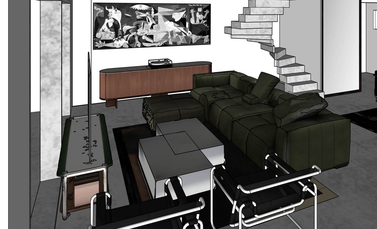 make the carpet pakistan bokhara style but not red the sofa should be a dark green color and leather material the lighting is like its 7pm on the evening
