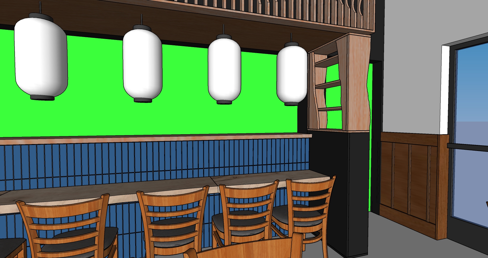 this is a tonkatsu izakaya place traditional japanese plates and cups on the tables the lighting should be soft and warm evening time glow the lanterns should have japanese script on them staying in the theme of a tonkatsu izakaya make the screen in the middle solid wood it s the back of the booth the greenscreen in the back is an industrial kitchen with a couple workers place soju and sake bottles on the shelf to the right there s a hallway behind the shelf that leads to the kitchen render the base of the shelf as black stained wood render the tiles as dark blue only place 2 people in the kitchen