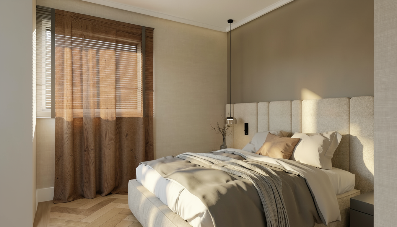 necesito convertir esta imagen en una imagen fotorrealista profesional mejora las texturas a ade un estor blanco de tela en la ventana y haz que la luz entre por ella de una forma suave resalta la pared del cabecero que lleva un papel pintado con una moldura los tejidos de la cama y el cabecero es un boucle blanco no a adas ni modifiques objetos
