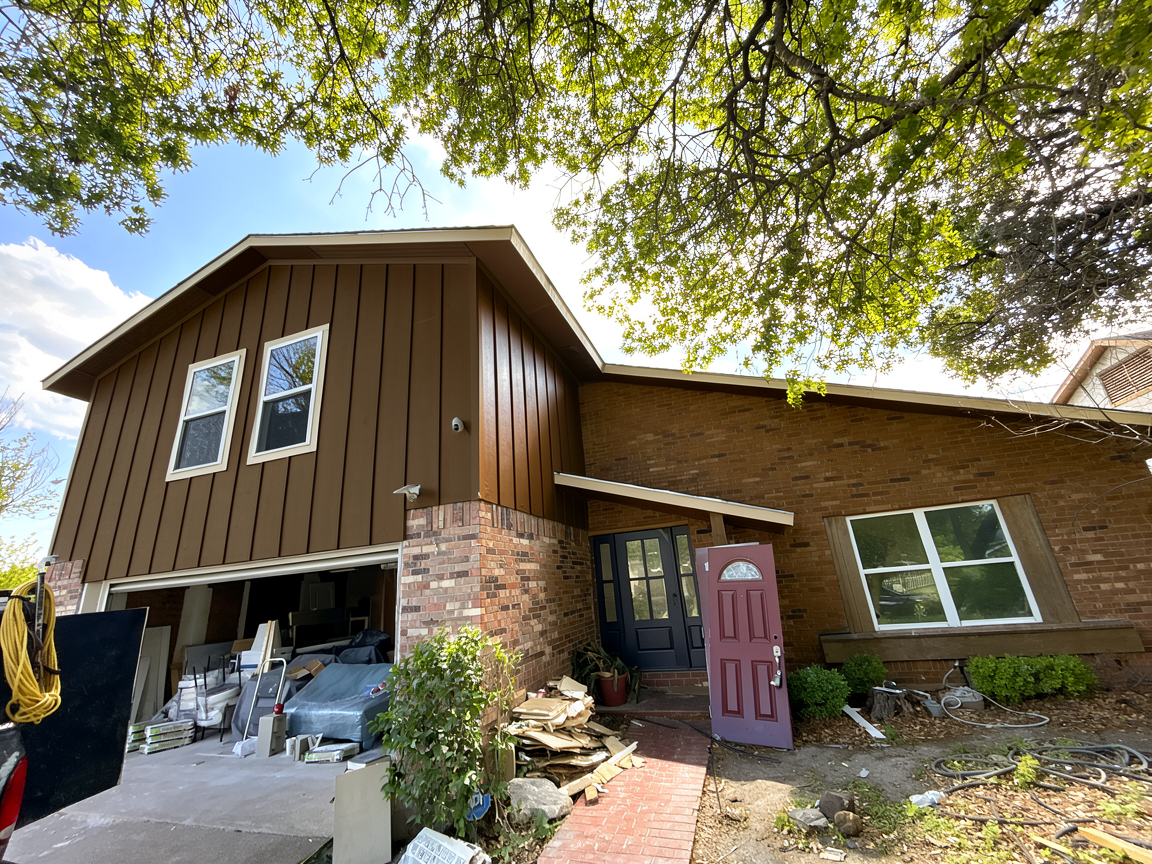 this is the road side elevation for a lake front home the front of the house does not have a view of the lake the house will have cedar wood vertical siding and should have a modern feel the roof should all be standing seam metal in a grey the large window unit on the 2nd floor is all recessed 2 to create a balcony the bottom 3 panels are stacking doors windows are doors that stack this house wants to feel warm but modern it is on a wooded lot show a portico instead of a porch at the entry