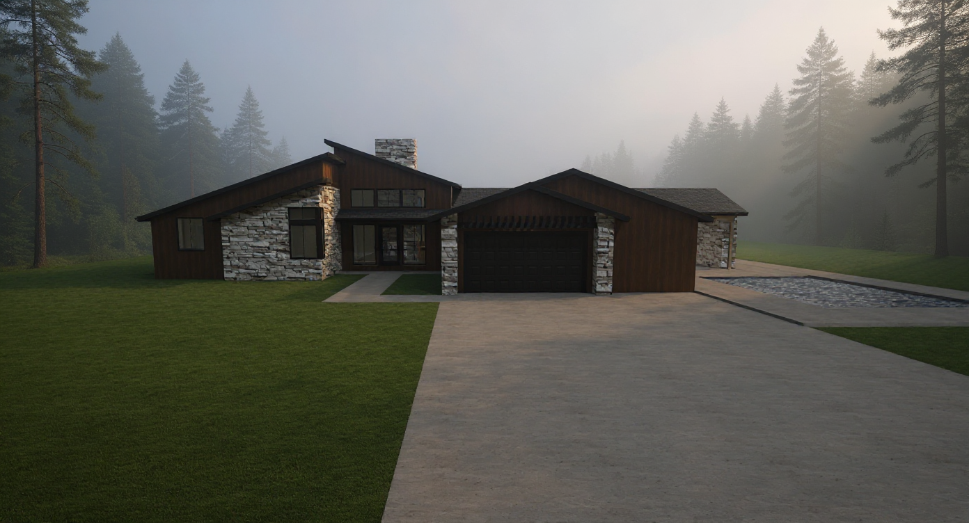 architectural watercolor rendering of a wide interior view of a day room inside a contemporary observatory suite space combining modern steel and glass construction with the warmth of a mountain cabin tall black steel framed glass fa ade opening to sweeping mountain views bathed in soft daylight interior features a sculptural staircase and a sleek glass and steel elevator rising through the space connecting to lower research levels and upper private rooms warm wood floors and ceilings minimal furnishings built in seating and a telescope near the window calm airy atmosphere with sunlight reflecting on the glass and casting long shadows rendered with crisp architectural geometry softened by watercolor washes pencil and ink linework and white paper edges fading out mood of quiet retreat precision and warmth combined
