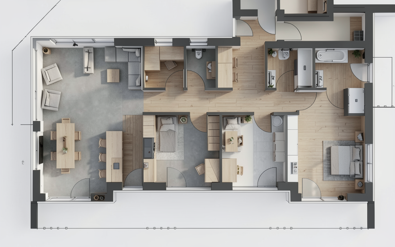 create a highly photorealistic interior scene with strong natural daylight increase the overall brightness of the room while maintaining realistic exposure and balanced highlights every element must have realistic materials and textures including the printer computers chairs desks glass walls and all furniture with accurate material properties and natural imperfections the floor must be dark gray matte epoxy resin smooth and seamless with subtle realistic reflections glass surfaces must have accurate transparency and light behavior replace the existing dark blue band on the ceiling with a black perforated metal suspended ceiling plafond suspendu m tallique ajour perfor noir it should surround the perimeter of the existing white ceiling blocks forming a border without covering or replacing them the perforations must be small and evenly distributed creating an ajour effect the metal should have a matte or satin black finish with realistic texture depth and natural light interaction the final image should look like a high resolution professional interior photograph extremely realistic bright detailed and naturally lit