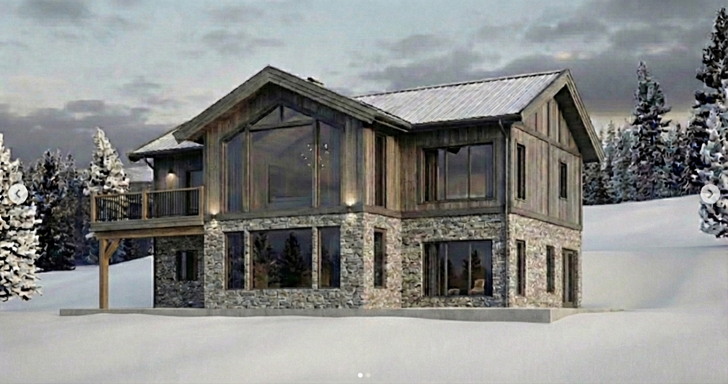 a cozy mountain chalet surrounded by a winter wonderland the house features rustic wooden textures in deep brown hues with stone accents in soft gray creating a warm inviting atmosphere large windows reflect the serene snowy landscape the roof is metallic gray complementing the natural colors snow covered trees stand tall around the house their branches laden with pristine white snow the overcast sky is painted in gentle shades of gray and light blue adding a tranquil serene mood to the scene