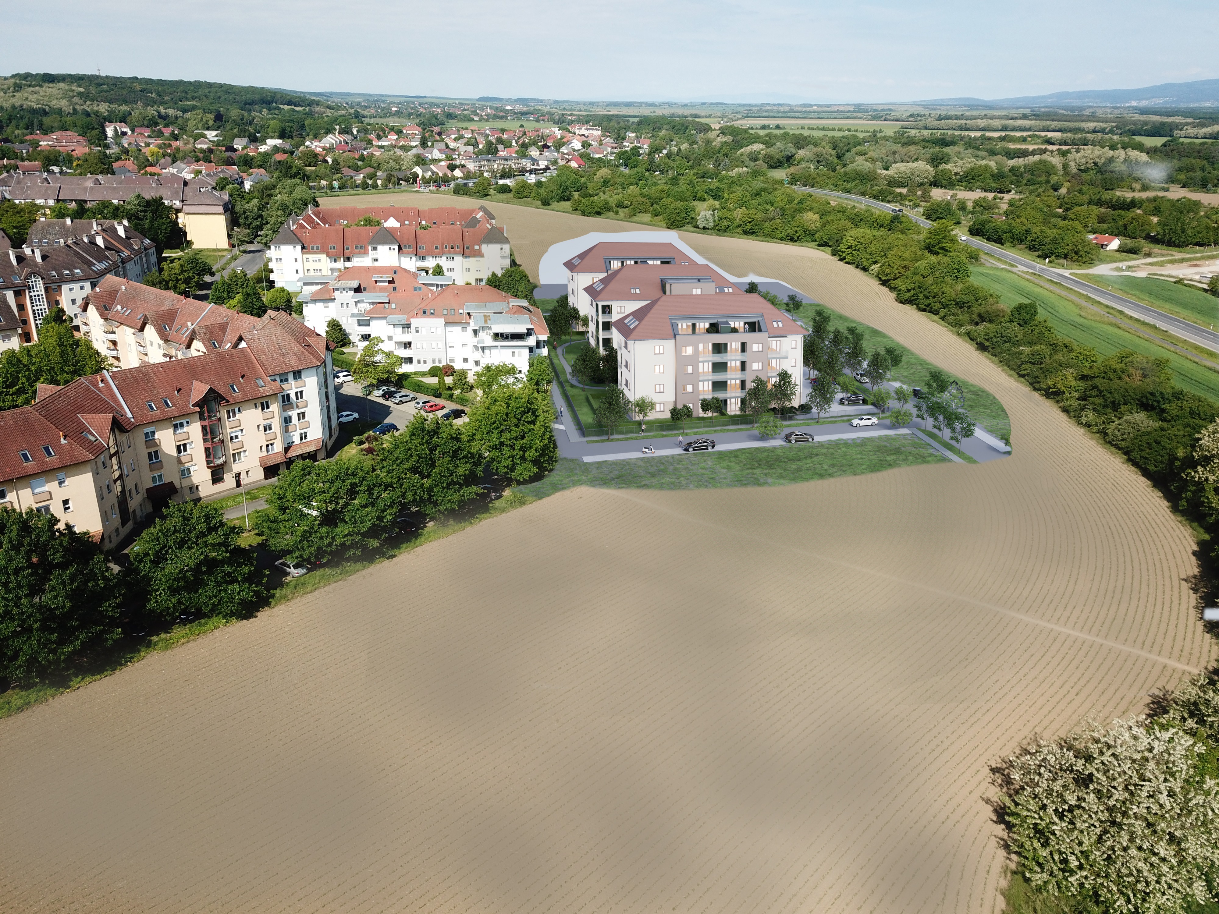 create an ultra realistic rendering of the inserted image without altering the building masses or overall geometry the facade plaster should be beige with a slightly textured plaster finish on the ground floor apply a glued limestone cladding as the facade surface all three designed houses feature pitched roofs with terracotta colored roof tiles the protruding brown volumes should have a light brown plaster finish the green colored sections at the balconies should also be rendered as plastered surfaces surround the buildings with green grassy areas bushes and pedestrian walkways the green areas around the houses should blend naturally into the existing terrain as if in a post construction state with a realistic slightly unrefined appearance ensure the overall result is highly realistic