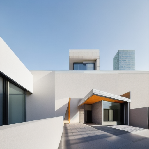 modernist exterior shot modern house with clear glass windows and concrete walls with wooden eaves and main door architecture