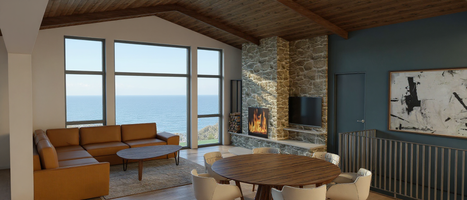 spot interni accesi linea gialla luce led accesa sulla destra il parapetto di vetro riflettente sulle pareti rispetta la foto esistente carta da parati nonostante le luci artificiali sono accese nella stanza giorno il sole delle 9 di mattina entra da sinistra con una angolazione verso la parete del tv il panorama esterno il mare i vetri degli infissi sono piu riflettenti piu luce solare il muretto sulla destra di vetro riflettente