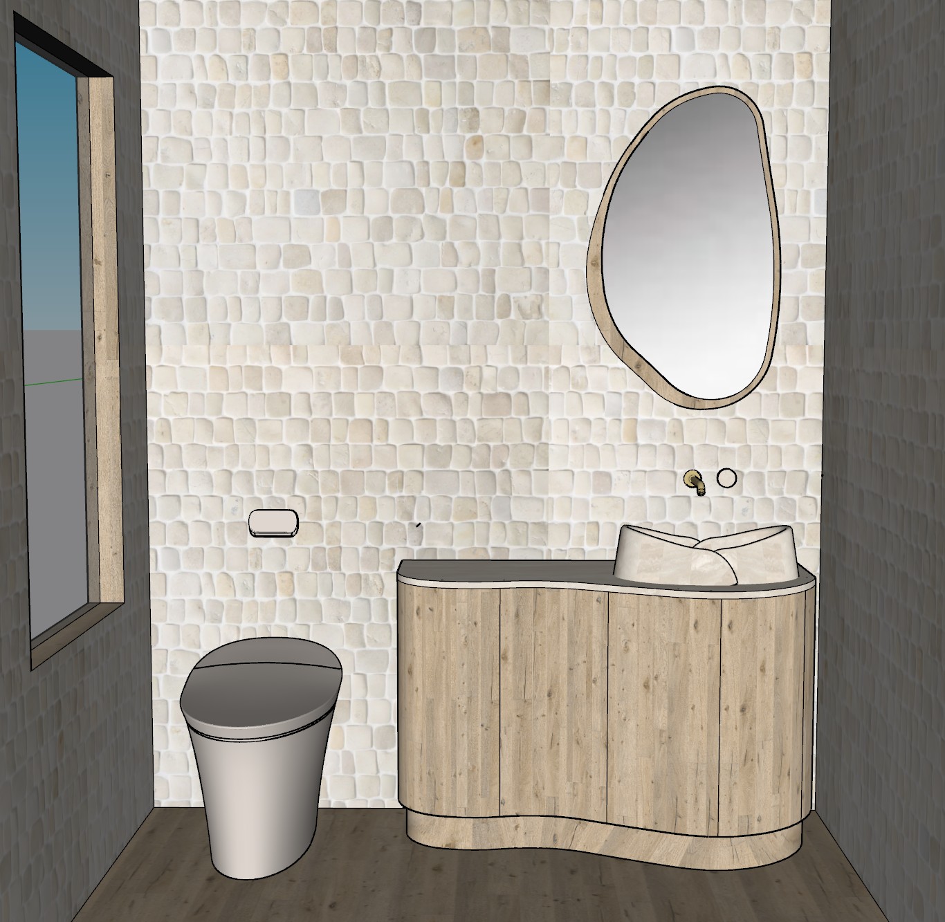 render this bathroom keeping the color tones as they are add a mountain garden view out of the window