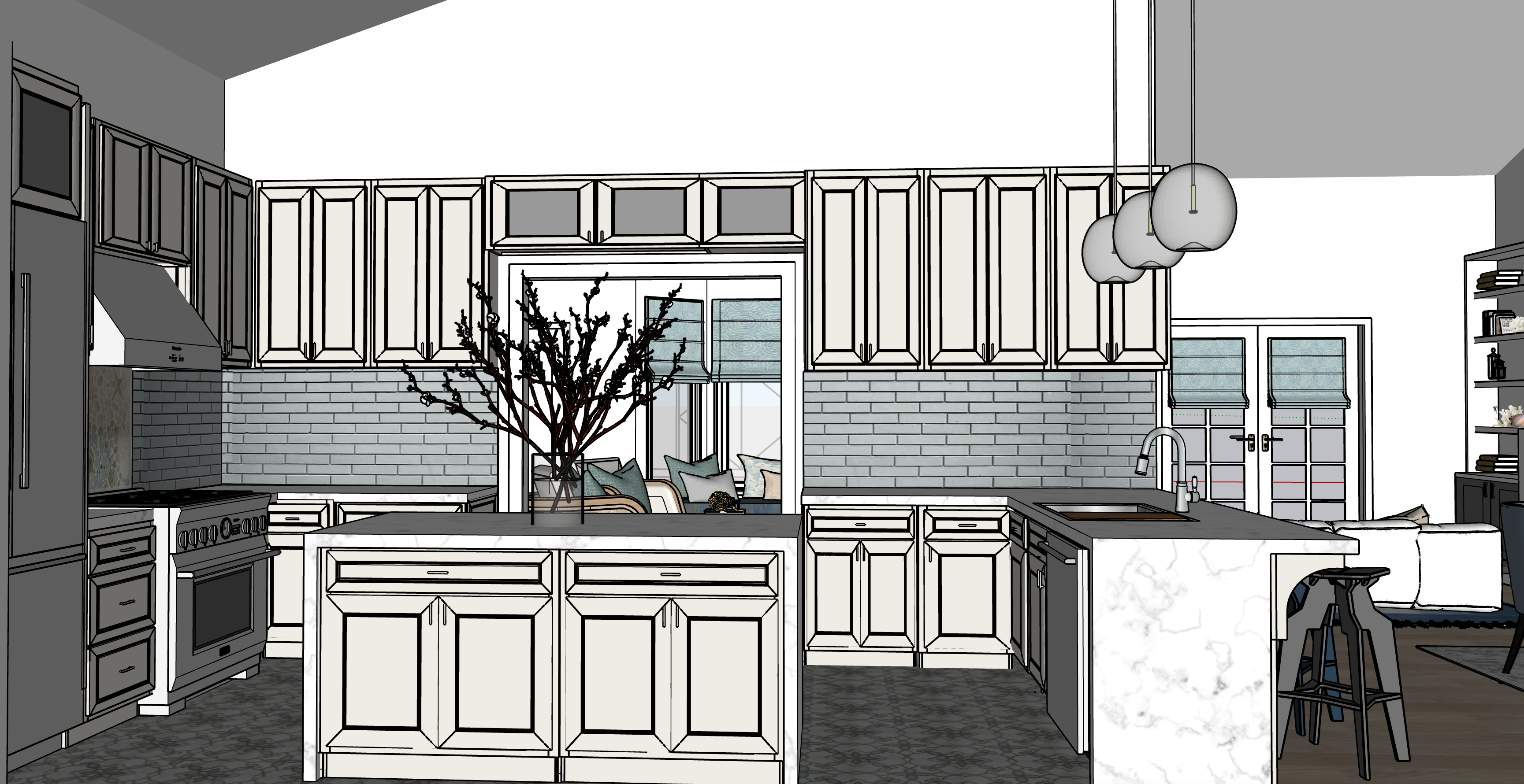 make photorealistic keep colors and materials the same cabinets are white make stove and hood stainless steal cabinets over the door only have glass doors