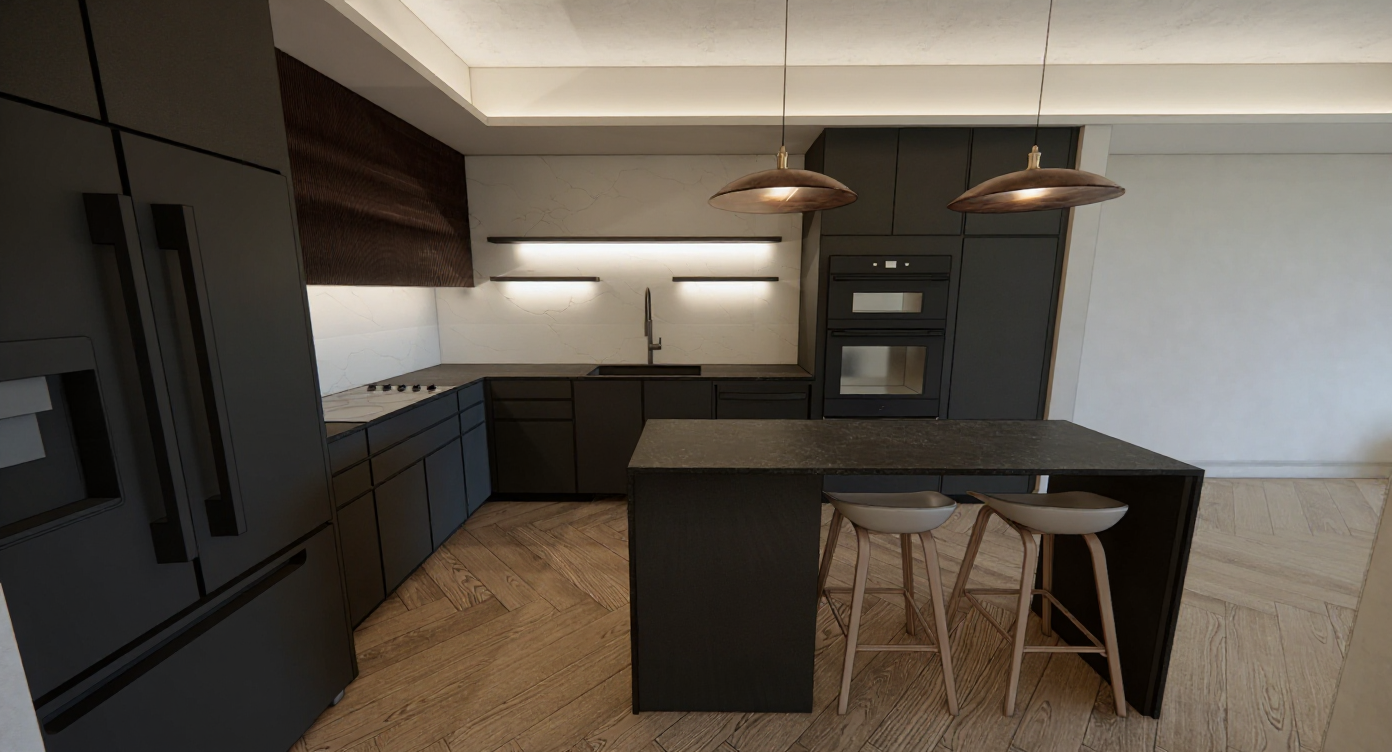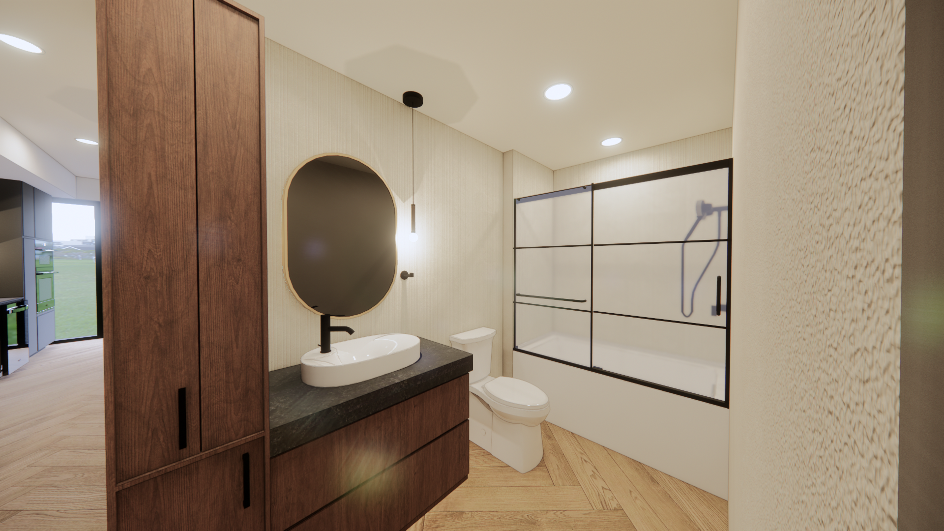 make the mirror backlit with a thin gold frame and add bathroom accessories add a towel to the towel bar on the shower door