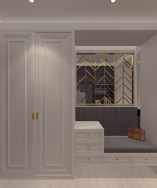use warm light ambiance enhance white the classical modern foyer design using gold handles add some indirect light in warm color below the bench flooring in beige marble in glossy finish enhance the realistic image for the cushion as well as the bag as the accessories of the image add some red high heels shoe on the floor to make it realistic and some flower vase on top of the credensa