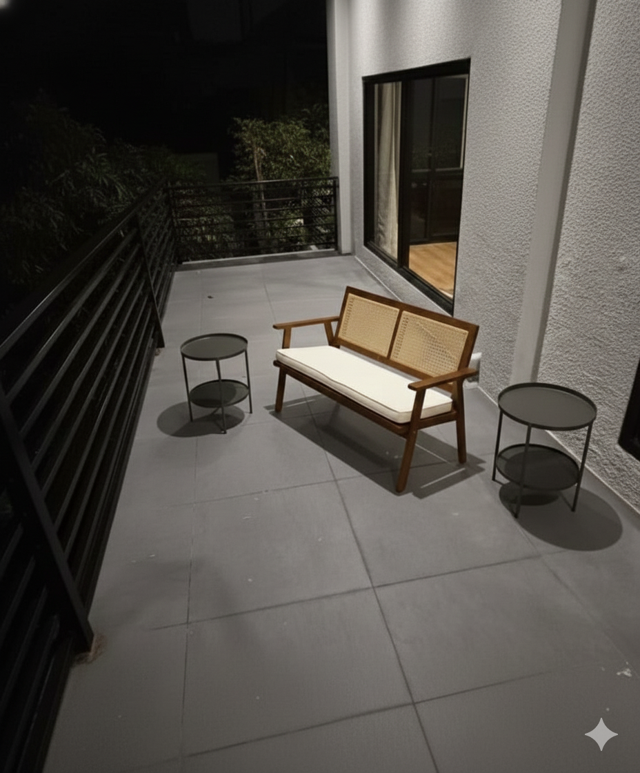 use the same background but stage the furniture with the end tables ajacent both sides of the wooden bench