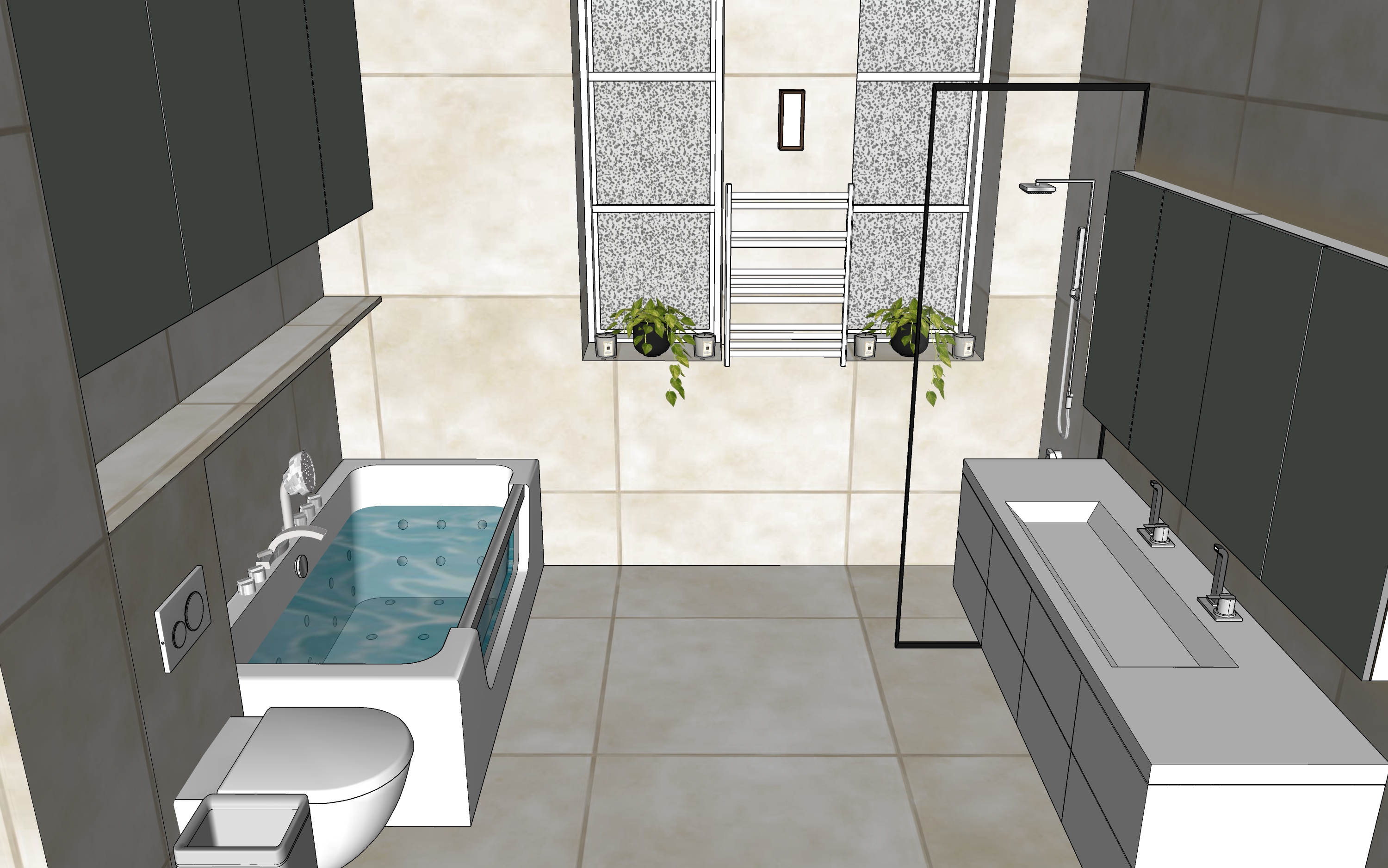 render a modern minimalist bathroom with a warm and relaxing and serene atmosphere and two white aluminum windows with brush glass the walls and floor should be a soothing cream natural stone color giving a warm and inviting feel incorporate a pristine white ceramic double sink and piano white undercabinet for a touch of elegance mirror cabinet above the countertop features warm led backlight above and below console cabinets are also led downlit there are two minimalist rectangular lamps on side walls complementing the sleek brushed steel faucets and fixtures ceiling feature a warm led strip light all aroung in the recess and each window incorporate a small warm downlight spot add a cozy blue hue to the water in the bathtub with gentle reflections to emphasize freshness add a nice plant next to the wc enhance the space with soft warm diffused lighting to create a tranquil ambiance above the tub incorporate a wall recess with led ligh as well in the shower