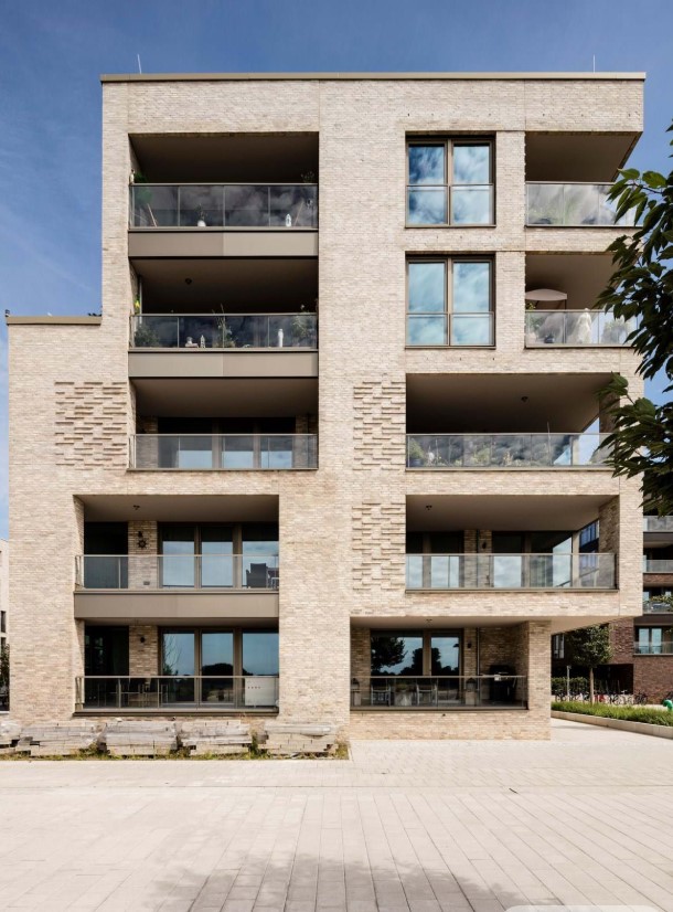 exterior shot modern minimalist building with a sleek design featuring white walls and floor to ceiling glass windows the exterior has subtle gray balcony railings the scene is set against a soft blue sky with fluffy clouds casting gentle shadows the atmosphere is serene and contemporary evoking a sense of tranquility and modern elegance