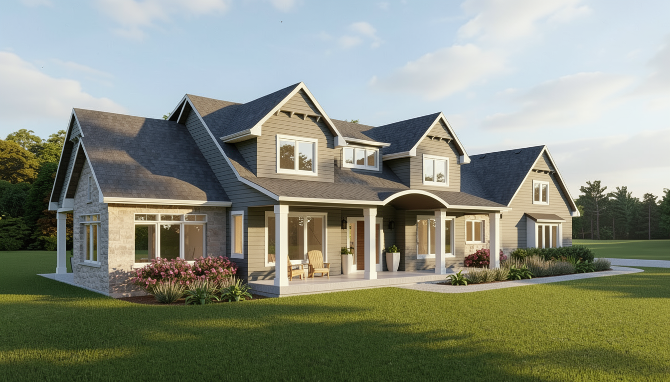 realistic colors shadows and sunlight keep windows transparent with view into house reduce ambient light maintain dark shingles on roof and standing seam roof above porch