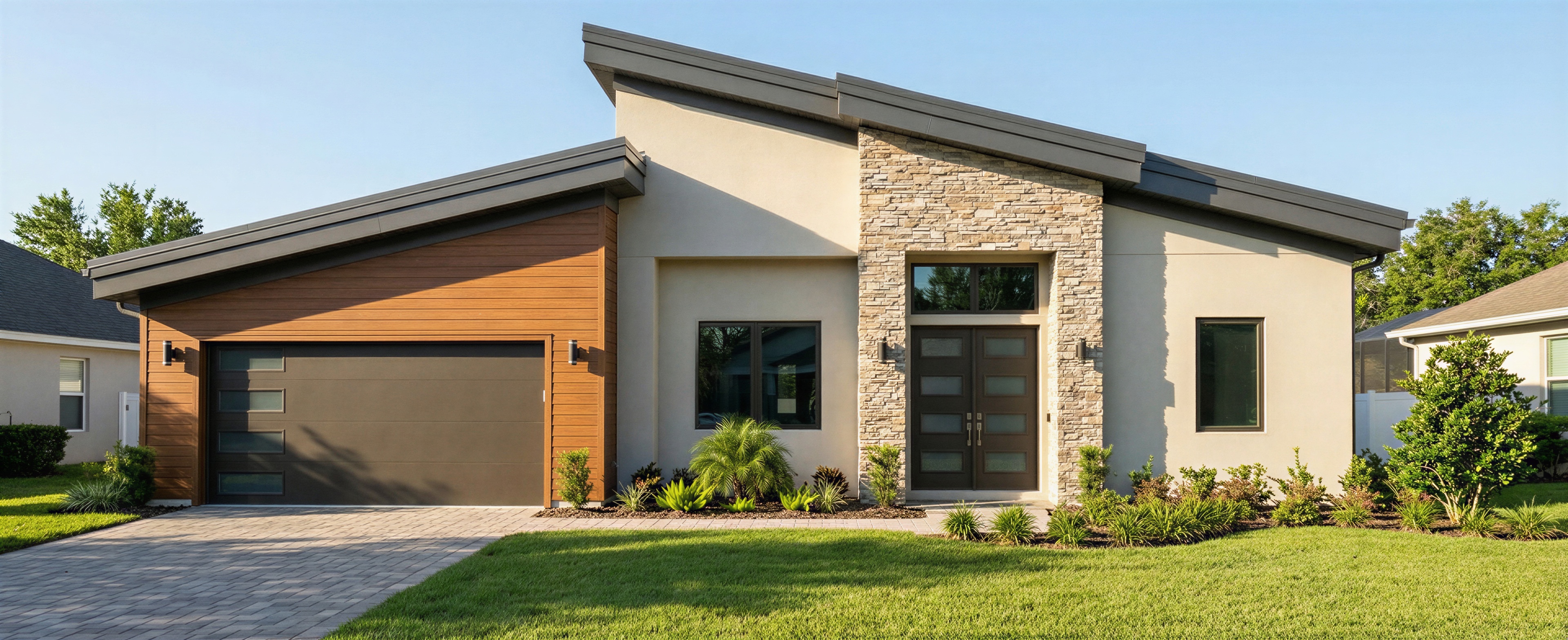 i need this image zoomed out some so you can see a blue sky with fluffy clouds a nice paver driveway some trees on the sides and maybe even the sides of the neighbors houses